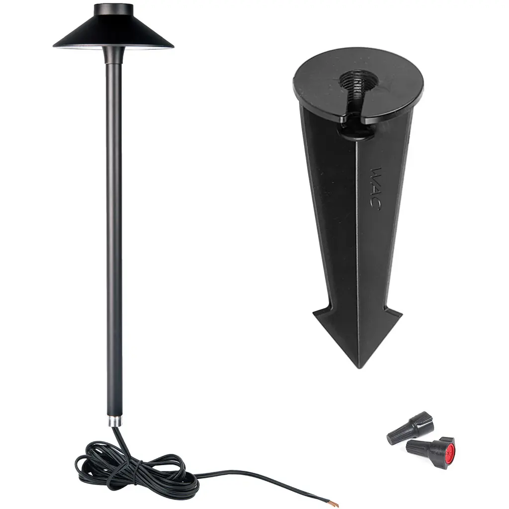 Simple, clean and efficient. The Tiki Path Light provides a wide sweep of light in a minimalist design that will blend into any landscape. Both the dome-shaped shade and stem are made out of a durable die-cast aluminum. This path light is powered by bright long lasting integrated LED's and can conveniently tap into any existing 12V landscape lighting system. Factory sealed and water tight with an IP66 rating for protection against high-pressure water jets and outdoor elements. Casted using a special k-alloy aluminum that is engineered to withstand the most challenging environments over time. Solid brass coated in bronze (-BBR finish) may be available for enhanced protection against corrosive elements and is recommended for use in coastal or marine environments. Includes a 9in mounting spike (Guardian Spike sku 9000-SP9-BZ sold separately for more durable mounting) and a 3ft lead wire with two gel filled direct burial wire nuts. A magnetic or electronic power supply is required (sold separately) for 12V fixtures. A variety of accessories are sold separately for additional mounting options.