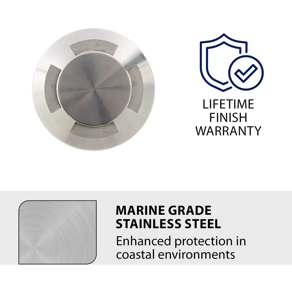 LED Landscape inground indicator lights are ideal for soft or concrete ground applications and available in 1 or 2 inch sizes with a variety of interchangeable screw-on face plates. This indicator light is perfect for indoor and outdoor applications in wells and ponds, pools, deck and patios, and ceiling or walls. Factory sealed and water tight with an IP68 rating for protection against submersion up to 5 meters under water and outdoor elements. Casted with 316 marine grade stainless steel in a polished stainless steel or bronze coated finish. Stainless Steel provides enhanced protection against corrosive elements and is recommended for use in coastal and marine grade environments. Each indicator light includes 3ft of low voltage burial cable, direct burial gel filled wire nuts, and an optional spring retention clip. Magnetic or Electronic Power supply is required. Concrete pour kits are available for concrete installation options.