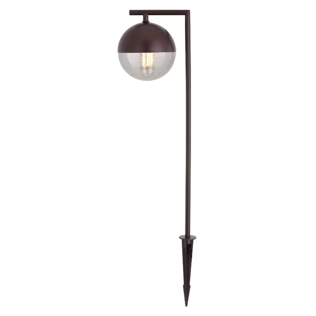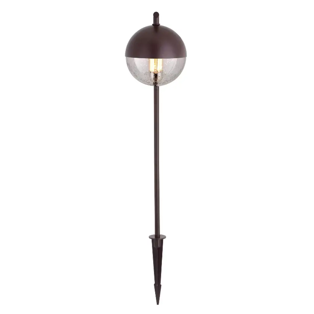 The Lisle low voltage LED bulb path light makes a contemporary statement about your home while offering functionality, energy savings, and security for your outdoor spaces. The versatile bronze finished metal dome and clear seeded glass shade combine to create a beautiful globe shape. Connect this walkway light with other landscape lighting products to customize and highlight your outdoor spaces. Ground stake, connector cable, and medium base T9 LED bulb included. Low voltage transformer required (sold separately).