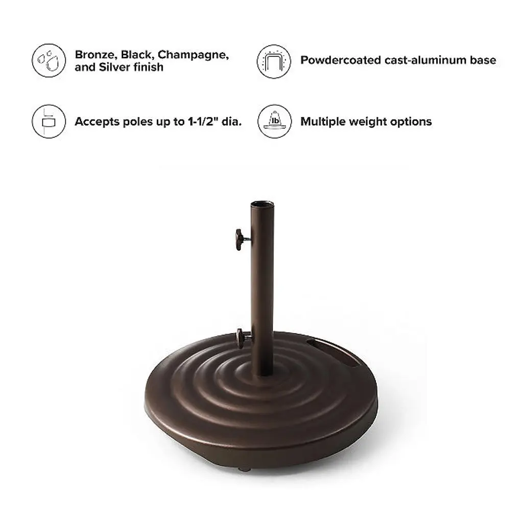 Our 30 lb. Add-on Weight for 50 lb. Belmont and 100 lb. Ribbed Bases provides additional stability for your umbrella in high-wind areas. The weight can be screwed on to the bottom of the 50 lb. base and the 100 lb base.Minor assembly required At Frontgate, our primary focus is quality. We guarantee that every product we sell will stand up to the supreme test – our customers' satisfaction. To learn more about our policies, visit our Shipping & Processing, Returns & Exchanges and Warranty & Price Guarantee pages.