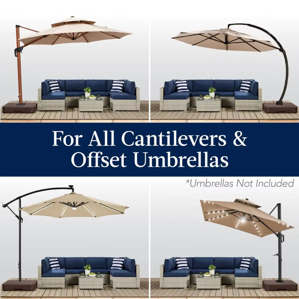 Enhance your relaxation with our versatile umbrella base, compatible with both U.S. and European cantilever offset umbrellas ranging from 6ft to 12ft. Effortlessly fill it with up to 330 lbs of sand or water through two easy-fill spouts, providing exceptional stability to keep your umbrella securely anchored. Made from durable high-density plastic, it's built to withstand various outdoor conditions while ensuring your shade remains steady. Designed for both offset and cantilever umbrellas, this base allows for easy adjustments, giving you the perfect shade coverage. Arriving fully assembled for quick setup, it's ideal for patios, decks, and poolside retreats. Create your perfect outdoor oasis and enjoy every moment in comfort and style.