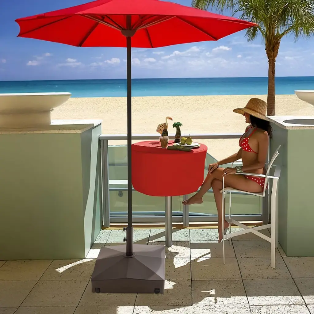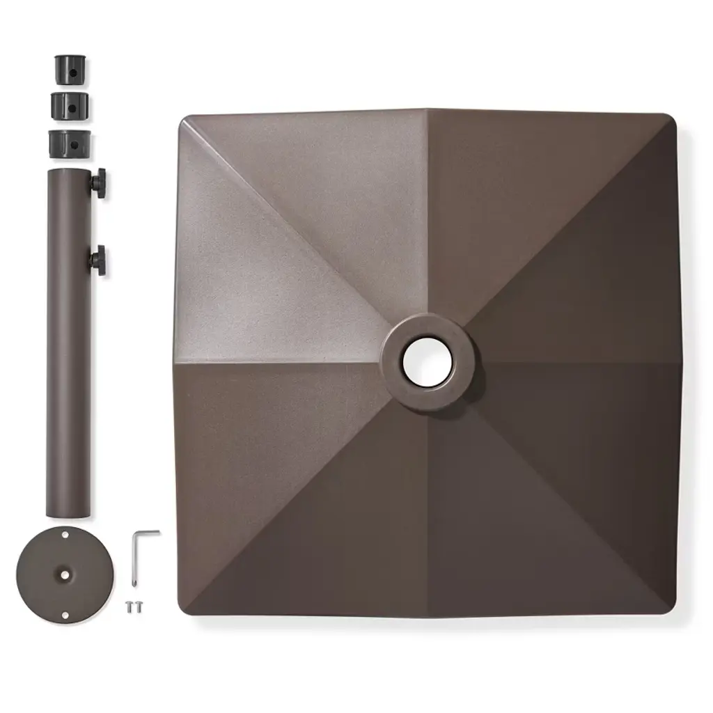 This heavy-duty umbrella base, crafted from high-density HDPE plastic, resists strong winds and ensures stability with a connective plate that secures the pole. It fits most market umbrellas with adjustable PVC sleeves, offers 360° rotation for easy mobility, and can be filled with sand or water for added stability, it includes three PVC sleeves (1-1/4", 1-1/2", and 1-9/10").