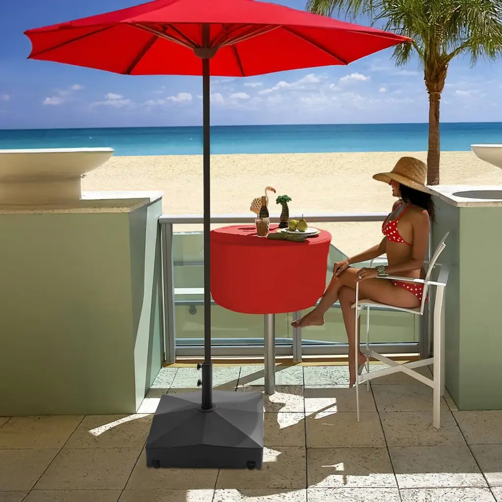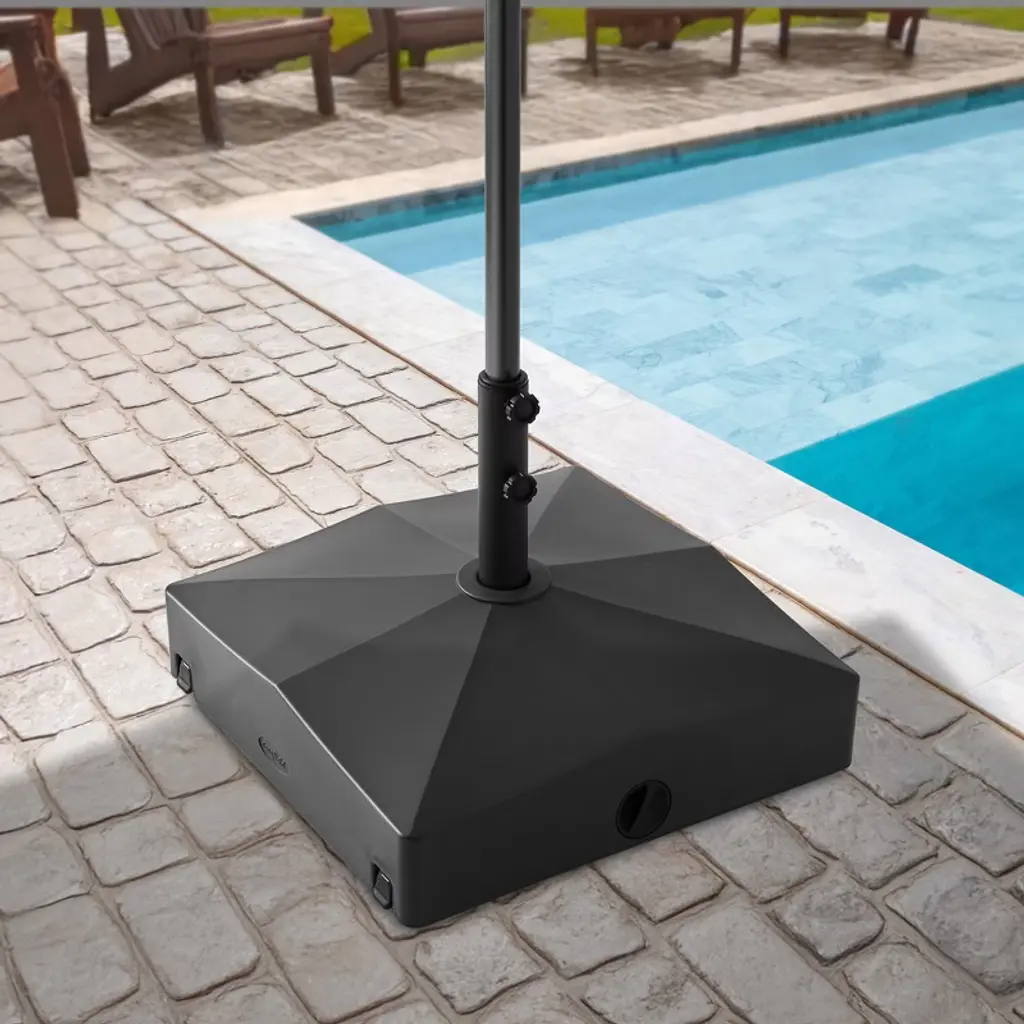 This heavy-duty umbrella base, crafted from high-density HDPE plastic, resists strong winds and ensures stability with a connective plate that secures the pole. It fits most market umbrellas with adjustable PVC sleeves, offers 360° rotation for easy mobility, and can be filled with sand or water for added stability, it includes three PVC sleeves (1-1/4", 1-1/2", and 1-9/10").