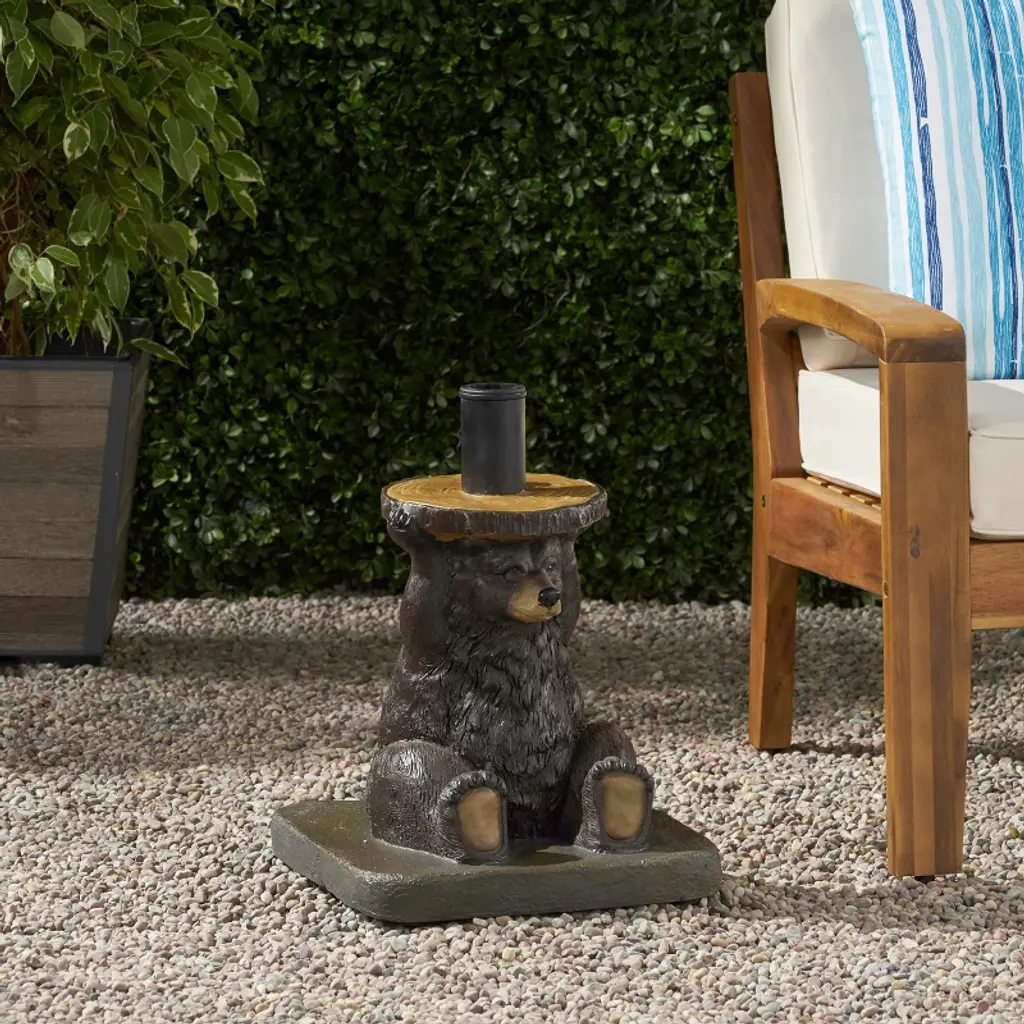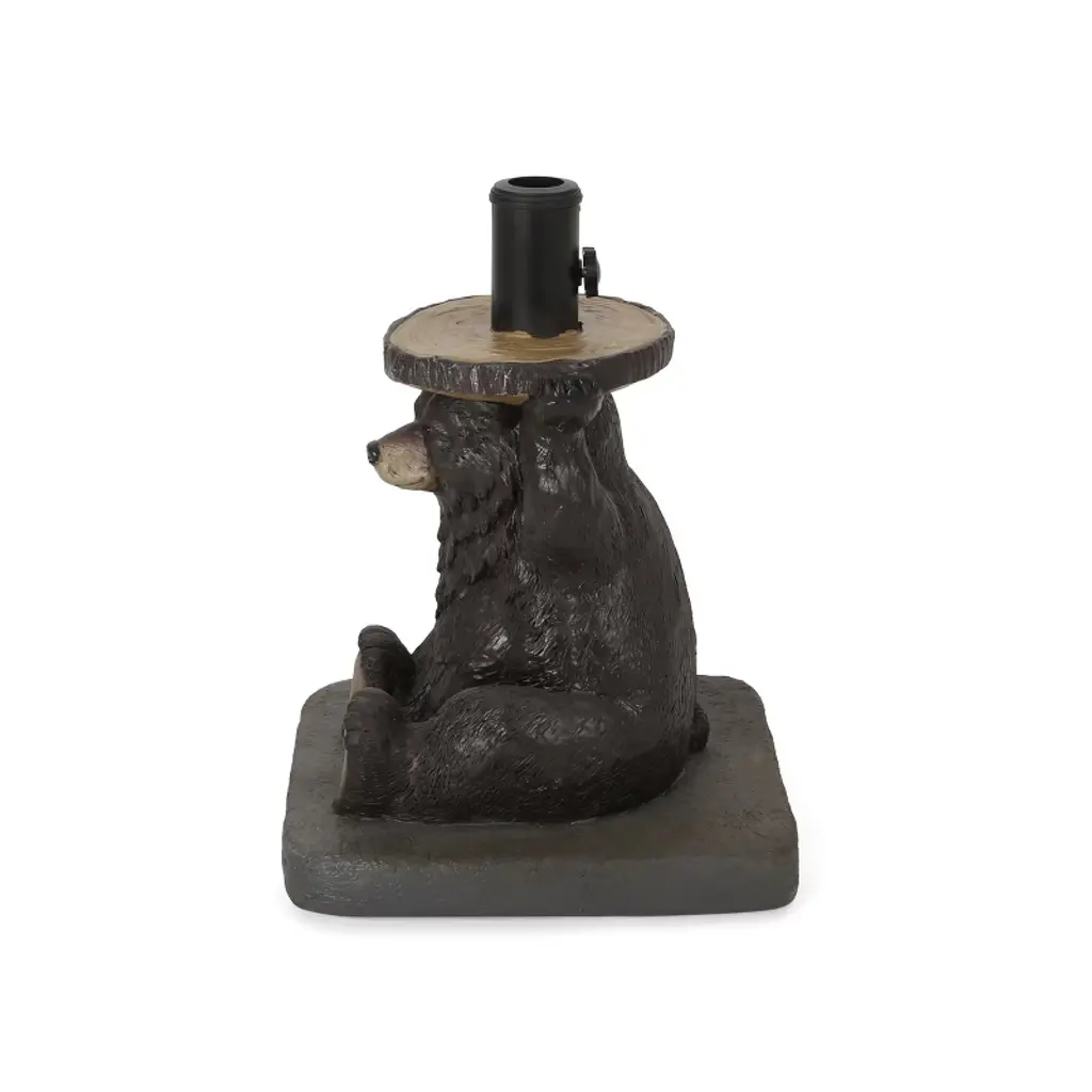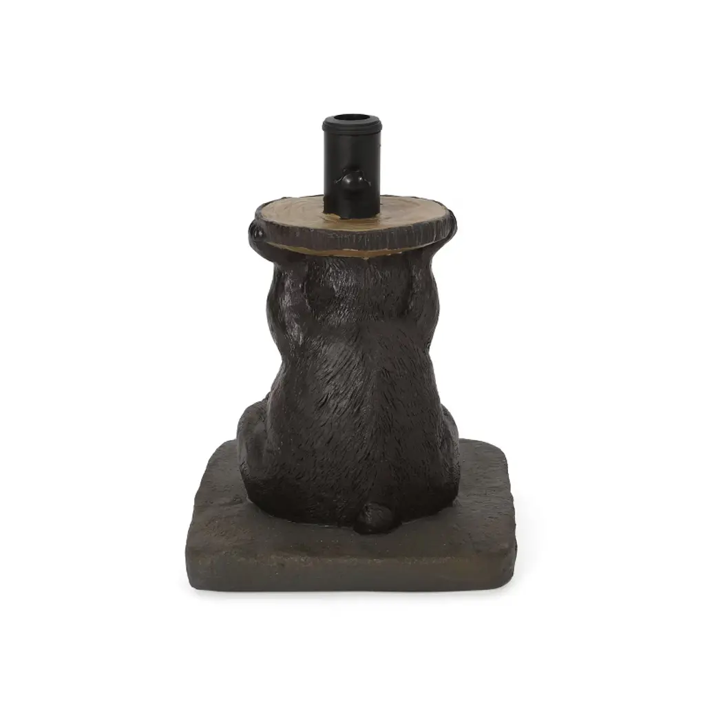 Embellish your outdoor space with a touch of refreshing quirkiness. Our cuddly bear umbrella base will enliven any backyard or patio with an enchanting woodland charm, ensuring that your umbrella is supported with adorable style. Built out of solid resin and concrete, this fifty-pound base includes adapters that can accommodate three different umbrella pole sizes. This whimsical accessory is finished with a base rod featuring a tightening knob that will secure your umbrella pole to provide a shady and relaxing outdoor experience for all to enjoy. Material: Lightweight Concrete Finish Material: Resin Pole Material: Iron Color: Dark Brown Maximum Umbrella Diameter: 6' Weight: 50.71 lbs No Assembly Required Dimensions: 13.50 inches deep x 13.50 inches wide x 18.00 inches high
