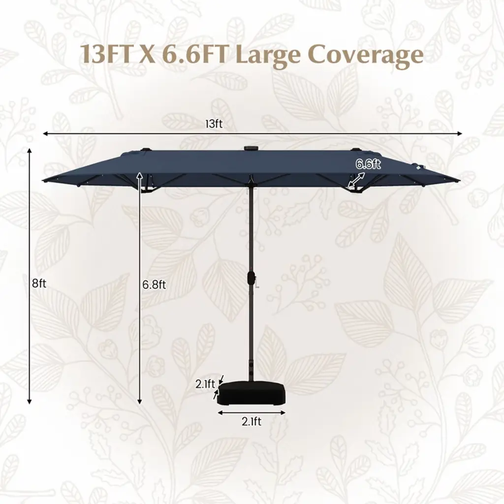 Creating a cool leisure zone with this patio cantilever umbrella! Let our solar-powered lights transform your patio into a dreamy oasis. With 36 solar powered LED lights that can run for 8 hours after being fully charged, the outdoor twin umbrella enables you to indulge in the inviting lights. Featuring 180g yarn-dyed fabric, our 13ft rectangular patio umbrella is non-fading, ensuring long-lasting protection. Coated with PA, the LED lighted patio umbrella will keep you protected from light rain and harsh sunlight. The thick metal poles and 12 sturdy ribs provide upgraded sturdiness, making it a sturdy addition to your outdoor setup. Besides, the cross base can be filled with a total of 132 lbs sand, making the double-sided umbrella stable to resist windy conditions. With 13FT X 6.6FT large coverage, the double-sided outdoor umbrella offers ample space for larger gathering. Featuring a crank handle that allows easy opening and closing, you can quickly enjoy the sun shade at anywhere, such as backyard, deck or patio. And a safety pin is included to prevent sudden closure. Features180g yarn-dyed fabric with PA coating is non-fading and drizzle-resistant 36 light beads will extend your outdoor recreation time Solar panel boasts 8 hours running time after being fully charged 1.5" thicker metal poles and 12 sturdy ribs ensure upgraded sturdiness Double-sided design creates enlarged shade area Easy to open and close the patio umbrella with smooth crack lifting system Each sandbags feature 66 lbs sand capacity to enhance the wind resistance Equipped with easy to setup cross base for enhanced stability Air vents provide cool and comfortable experience Firmly stitched rib pockets keep the umbrella ribs in place Equipped with safety pin to prevent the umbrella suddenly closing Convenient fixing strap allows for easy storage and folding Suitable for poolside, deck, patio, garden, yardColor: Beige/Tan/Gray/Wine/Navy/Orange Material: Metal, 180g Yarn Dyed Fabric, PA Coating Overall Size: 13’ x 6.6’ x 8’ (L X W X H) Cross Base Size: 2.1ft x 2.1ft (L X W) Umbrella Ground Clearance: 6.8’ Net Weight: 32 lbs Package includes: 1 x Dual-sided Patio Umbrella 1 x Umbrella Stand 1 x User’s Guide