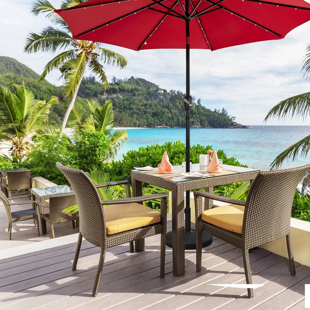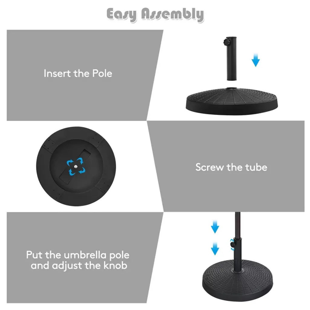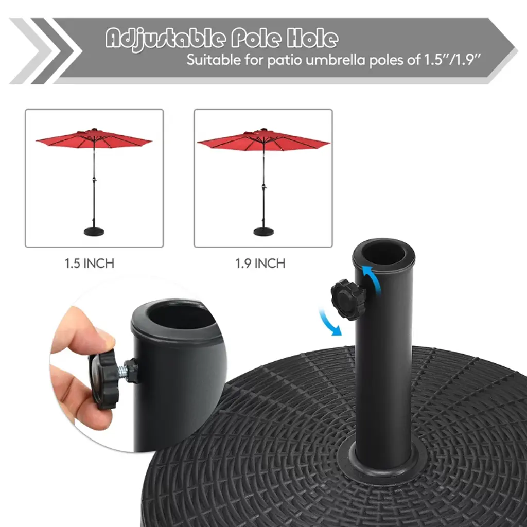 This 49lbs resin umbrella base will be a fabulous choice for outdoor usage. The heavy weight ensures high stability of the patio umbrella. And we selected high-grade resin as the material of the umbrella base, enabling remarkable performance on resisting heavy sunlight, water and corrosion. Additionally, the umbrella base not only possesses practical utilities but also owns attractive appearance. Such a heavy-duty resin umbrella base is perfect for outdoor use. Umbrella poles of 1.5'' and 1.9'' can be used with our base. You will not regret if you get this resin umbrella base.FeaturesSuitable for balcony, backyard, poolside, etc Compact size makes storage much more convenient High-grade resin material with black finish for long time use 49lbs heavy weight for strong support to patio umbrella 2 plastic adapters allow for umbrellas of different sizes Rattan design makes the resin base more attractive Sturdy steel pole effectively secures umbrella pole Detailed instruction and complete hardware for easy assemblyColor: Black Material: Resin + Steel Overall Dimension: 20.5'' x 14'' (D x H) Suitable Diameter of Pole Hole: 1.5'' / 1.9'' Length of Steel Pole: 10'' Net Weight: 49 lbs Package Includes: 1 x Resin Umbrella Base 1 x Instruction