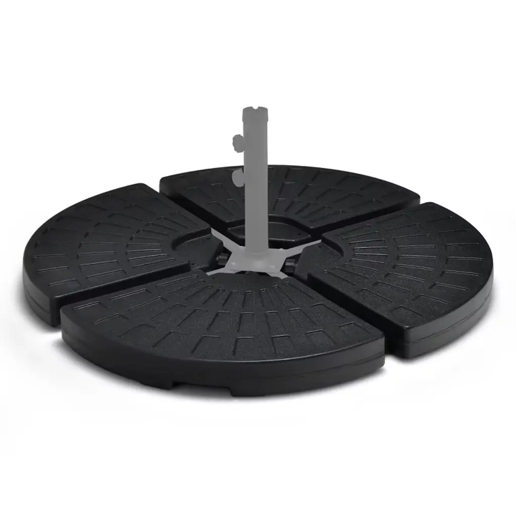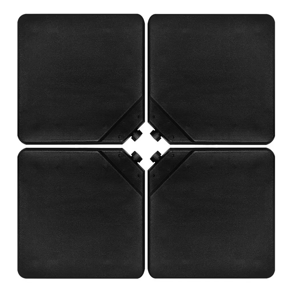 Reliably support your cantilever umbrella with the heavy duty umbrella base! Made of high-quality HDPE material, which is weather-resistant and not easily deformed, our 4 pcs square umbrella base can last for a long time. The 4 separate plates can be put together quickly to fit your umbrella cross bar base(not included). With easy to fill spout, large capacity water and sand can be filled to enhance stability and wind resistance. But the umbrella base is surprisingly lightweight before filled with water. Moreover, it comes with hidden handle to make it easy to carry. And the 4 plates are stackable, making it easy to store when not in use. FeaturesPremium HDPE material is sturdy and crack-resistant Each plate can be filled with 3.4 Gal water/43 lbs sand Fill the umbrella base easily with spouts Equipped with hidden handle for easy movement Each plates can be stacked up to save space Circulation holes add friction and stability Ideal for various places with convenient storage & transport design Holes for inserting locking pins(not include) facilitate tight connectionColor: Black Material: HDPE Overall Dimension: 40'' x 40'' x 2.5'' (L x W x H) Single Plate Water Capacity: 3.4 Gal Single Plate Sand Capacity: 43 LBS Single Plate Water & Sand Capacity: 54.5 LBS Net Weight: 17.5 lbs Package Includes: 1 x Umbrella Base 1 x User's Manual