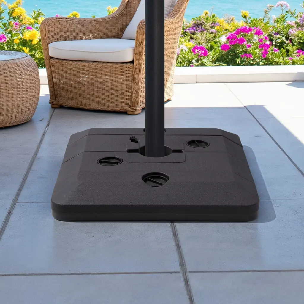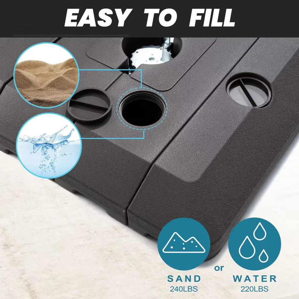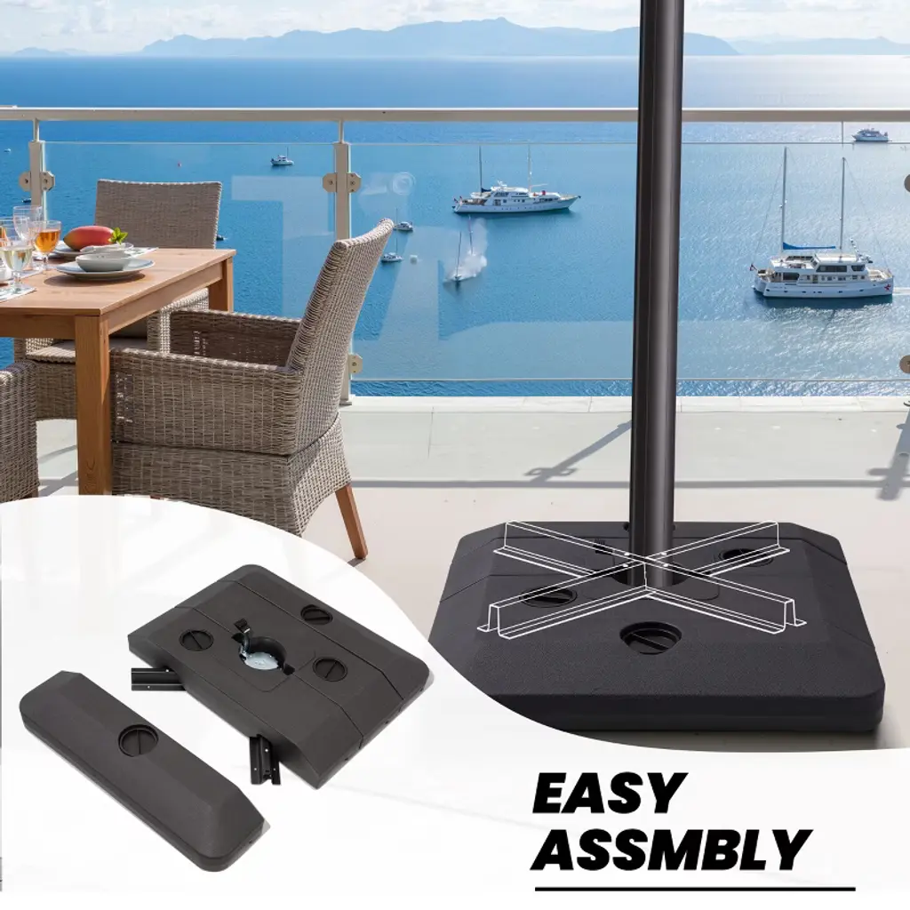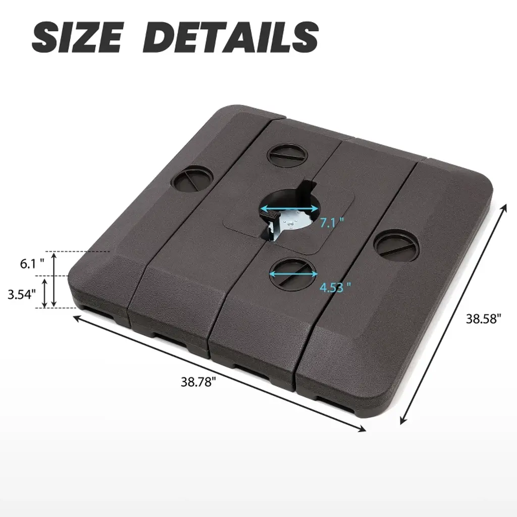 Lounge in the shade on hot summer days with this This Patio Umbrella Base. The four pieces weighted plates of this patio umbrella stand can contain a total of 240lbs of sand or 220lbs of water to hold your offset or cantilever umbrella steady. Or even heavier when combined with both sand and water. The entire base is approximately square and consists of four fillable plates, each with a water fill port. The base is divided into 4 pieces, which makes it easier to carry and move, and easy to fill/drain. This design make it simple to transport your base just about anywhere. Features: Includes one black base only, no umbrella, no cross stand The entire base is approximately square Consists of four fillable plates Divided into 4 pieces, easy to carry and move, and easy to fill/drain. Made from high-Strength HDPE Material Can be filled with water, sand, or sand & water mixed Dimensions: Overall dimensions (four plates): 38.78"(L) x 38.58"(W) x 3.54/6.1"(H) Material: Plastic (HDPE) Capacity: 220lbs Water or 240lbs Sand, or Water&Sand Mixture Includes: 4 Base plates