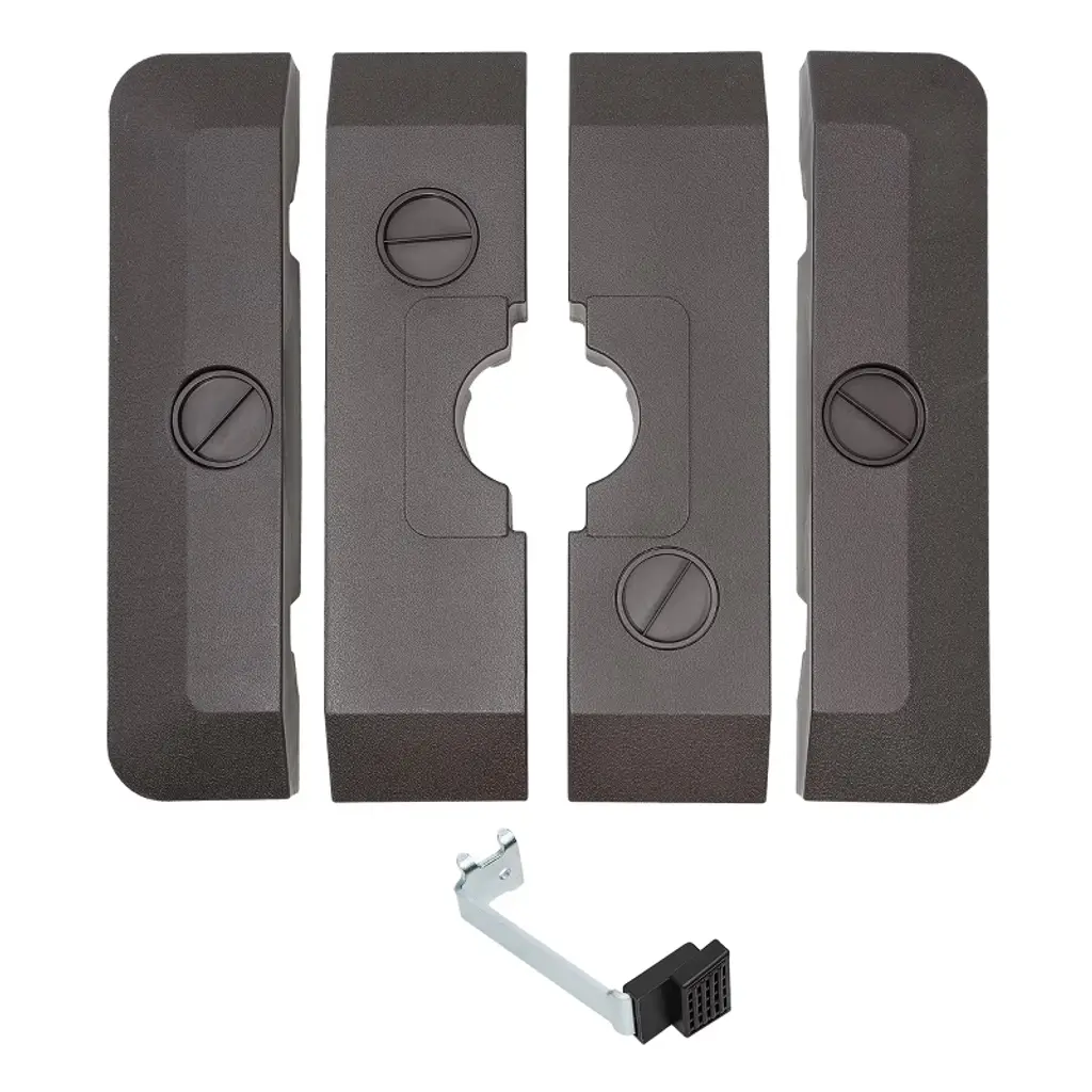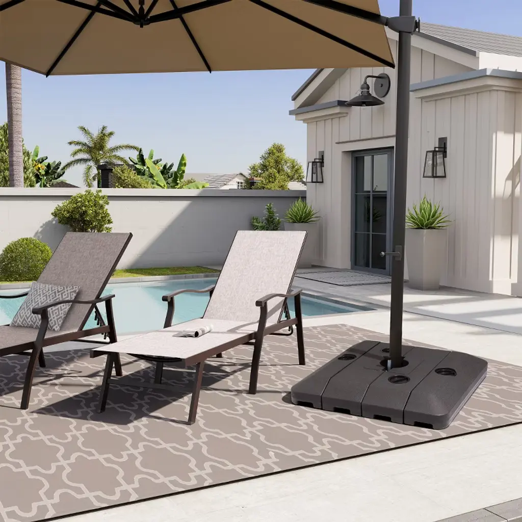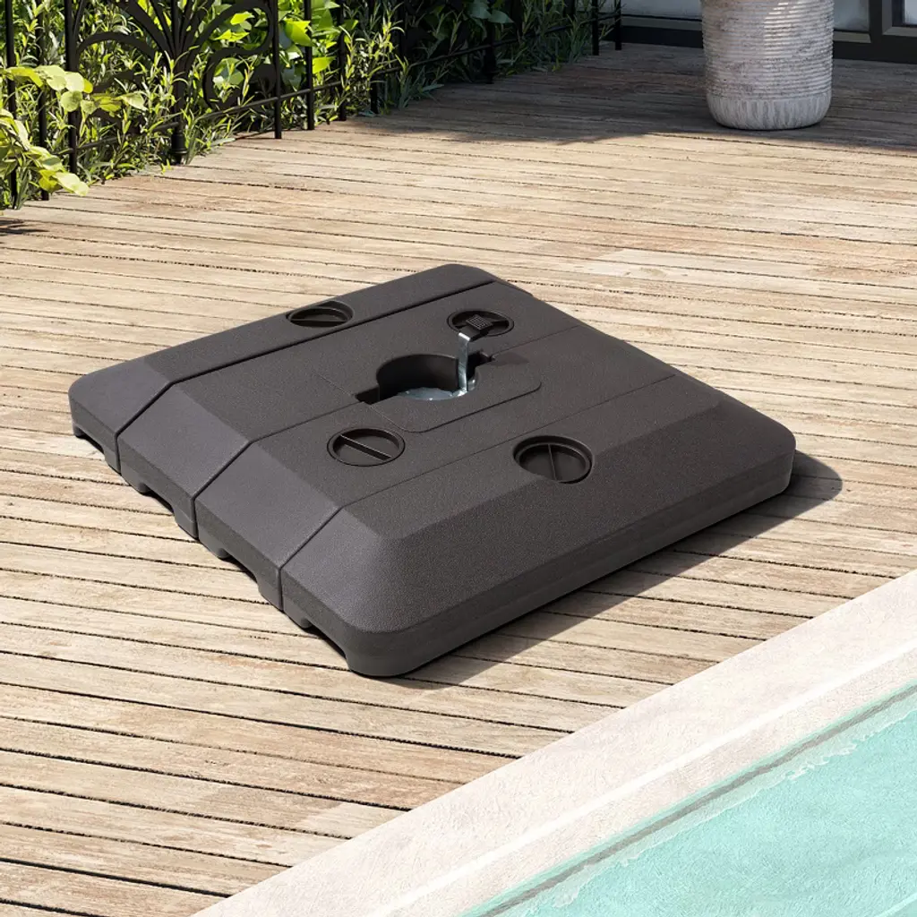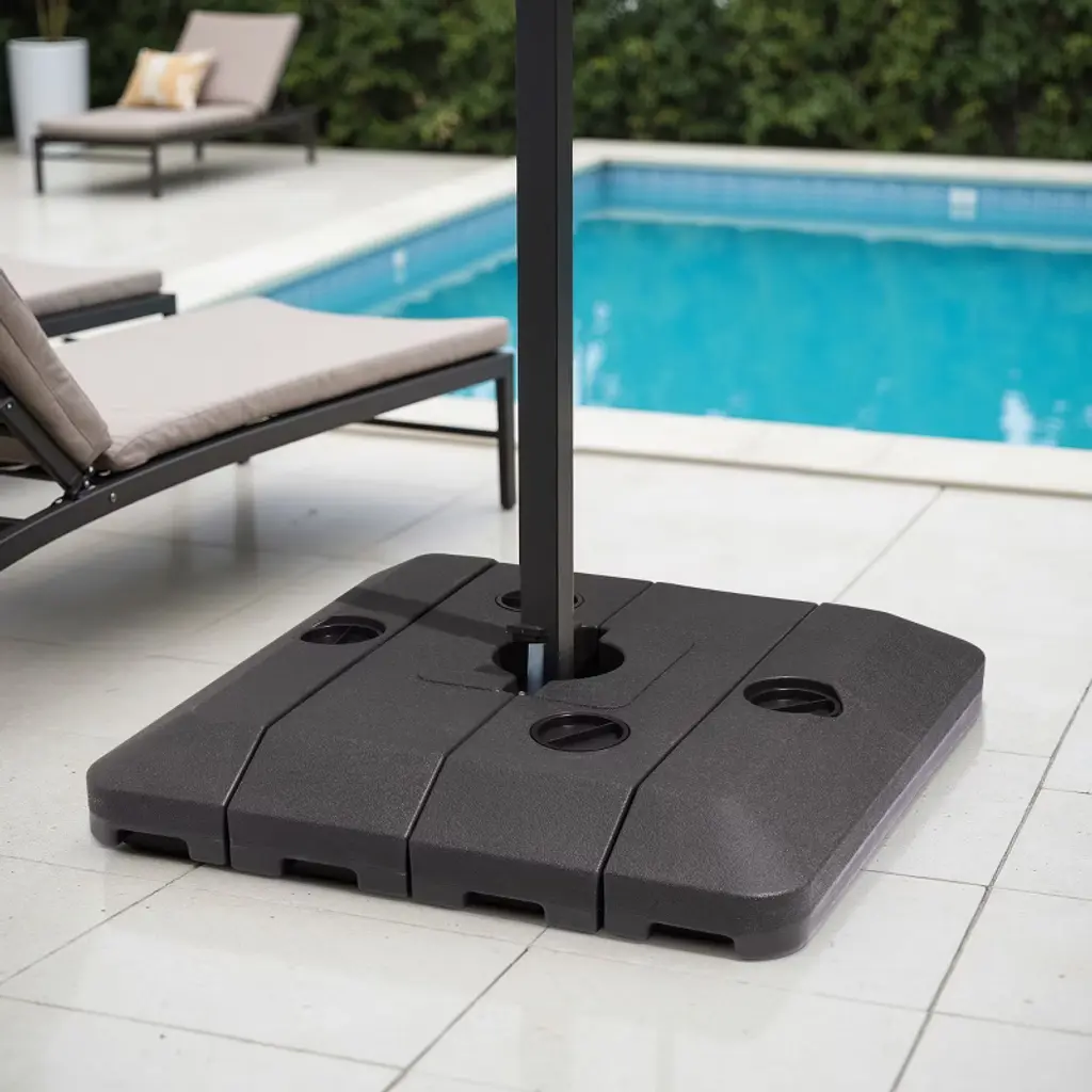 Lounge in the shade on hot summer days with this This Patio Umbrella Base. The four pieces weighted plates of this patio umbrella stand can contain a total of 240lbs of sand or 220lbs of water to hold your offset or cantilever umbrella steady. Or even heavier when combined with both sand and water. The entire base is approximately square and consists of four fillable plates, each with a water fill port. The base is divided into 4 pieces, which makes it easier to carry and move, and easy to fill/drain. This design make it simple to transport your base just about anywhere. Features: Includes one black base only, no umbrella, no cross stand The entire base is approximately square Consists of four fillable plates Divided into 4 pieces, easy to carry and move, and easy to fill/drain. Made from high-Strength HDPE Material Can be filled with water, sand, or sand & water mixed Dimensions: Overall dimensions (four plates): 38.78"(L) x 38.58"(W) x 3.54/6.1"(H) Material: Plastic (HDPE) Capacity: 220lbs Water or 240lbs Sand, or Water&Sand Mixture Includes: 4 Base plates