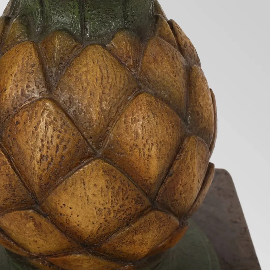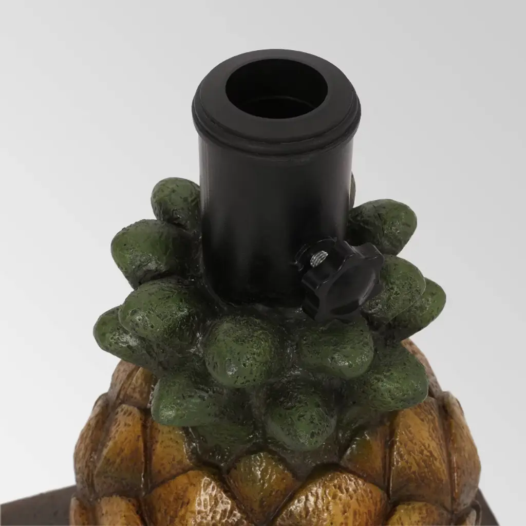 Our delightful pineapple umbrella base will enliven any backyard or patio with a refreshing tropical charm, ensuring that your umbrella is supported with adorable style. Built out of solid resin and concrete, this fifty-pound includes adapters that can accommodate three different umbrella pole sizes. This whimsical accessory is finished with a base rod featuring a tightening knob that will secure your umbrella pole to provide a shady and relaxing outdoor experience for all to enjoy.PINEAPPLE DESIGN: Our umbrella base offers a delectable pineapple design that holds your umbrella within its leaves. Complete with intricate details and bold colors, this accessory is sure to capture the hearts of all your guests.CONCRETE, RESIN, AND IRON: This umbrella base is constructed with iron, resin, and concrete for a heavy, solid structure that also offers stunning design details. This has a weight of fifty pounds, ensuring a firm hold on your umbrella.INCLUDES ADAPTERS: Our umbrella stand comes with adapters to accommodate different diameter umbrella poles. This base can accommodate 1.50 inch, 1.75 inch, and 2.00 inch diameter poles. This is combined with a base weight of fifty pounds, ensuring a firm hold on your umbrella.DIMENSIONS: Choose an accessory that is the perfect size for you and your furniture. This umbrella base is 14.00” W x 14.00” D x 18.00” H. You will love how much your space can transform with the simple addition of this umbrella base.NO ASSEMBLY: This umbrella holder comes ready to use straight out of the box. No assembly is required.