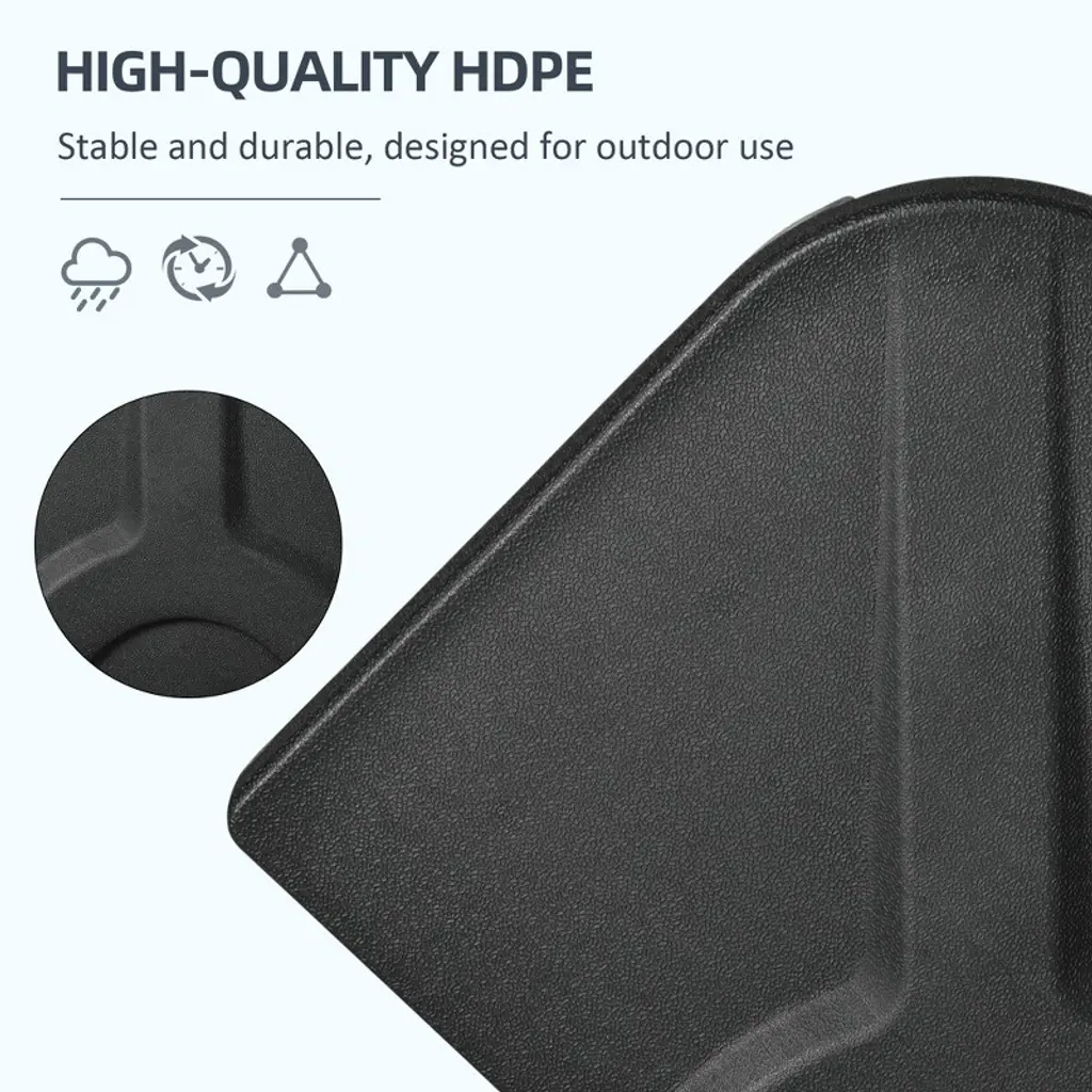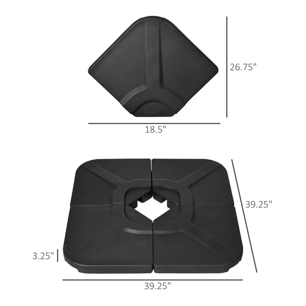 Gulches 4-piece black cantilever umbrella weights stabilize offset umbrellas, reaching 175 lbs. with sand or 130 lbs. with water. Thick HDPE ensures weather/sun resistance. Each plate has a screw cap (prevents leaks) and built-in handle; stackable for easy storage. Fits 39.25"L x4"W x2.25"H cross bases. Compatible with Outsunny X-84D-187/X-84D-085. Overall: 40"L x40"W x3.5"H. Measure first for fit.