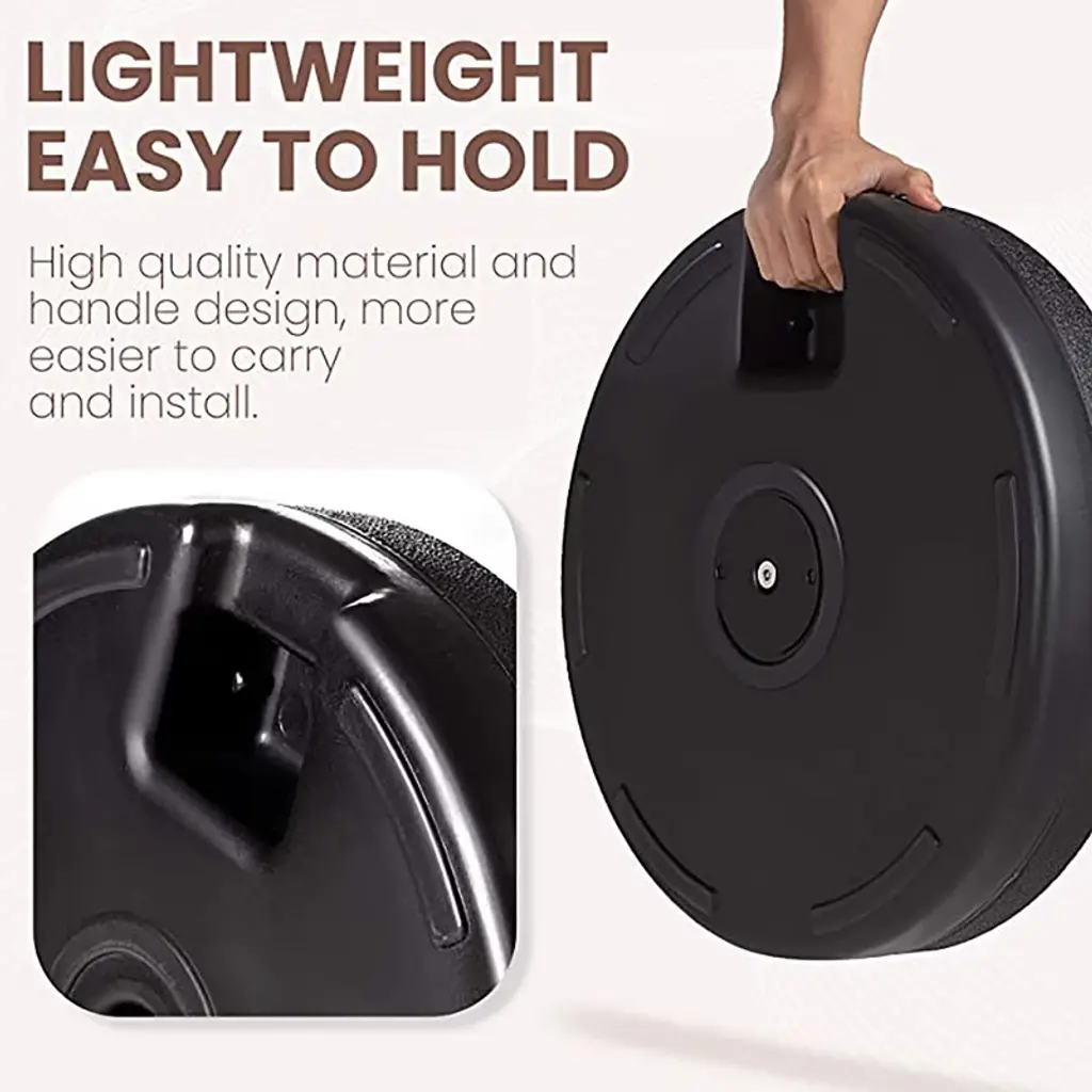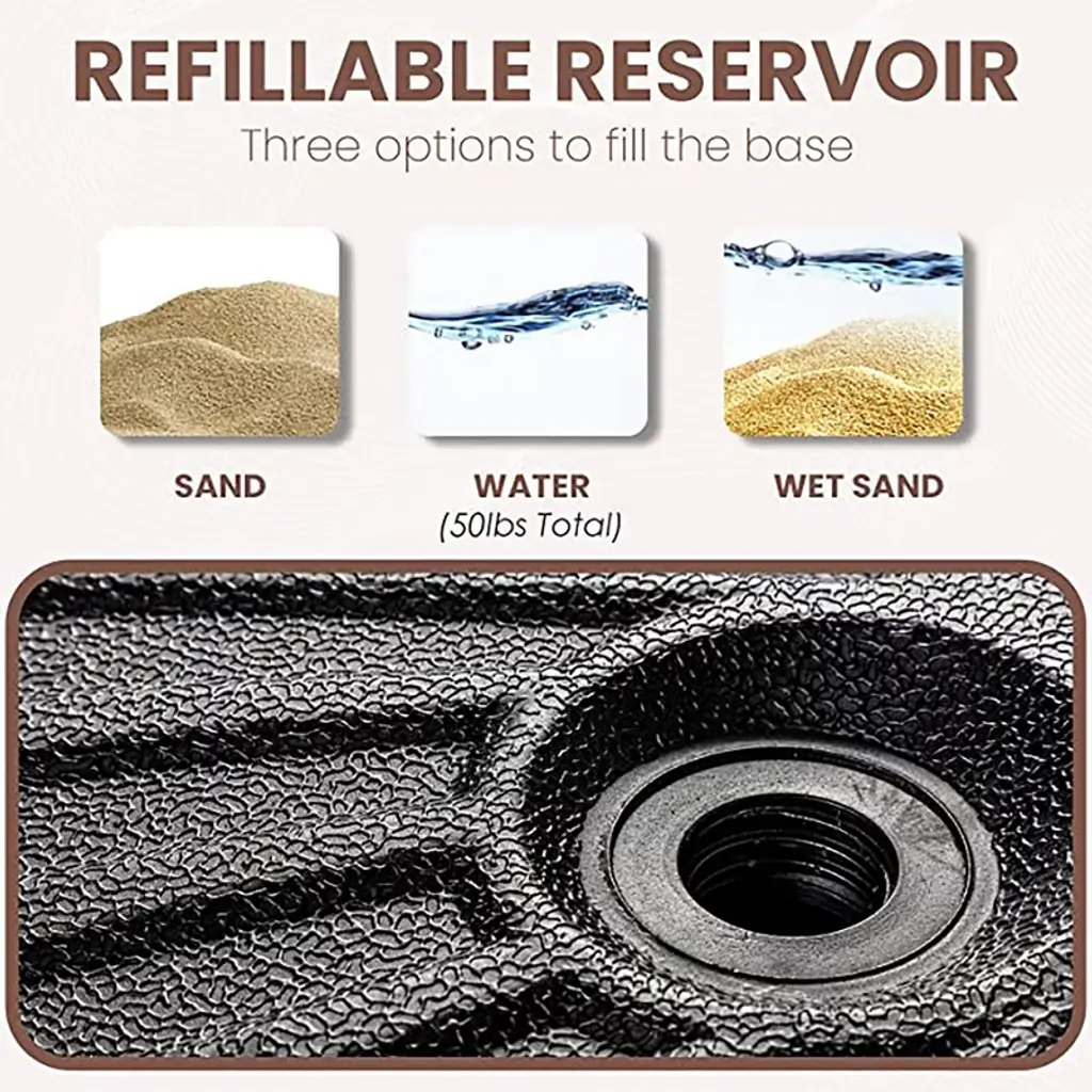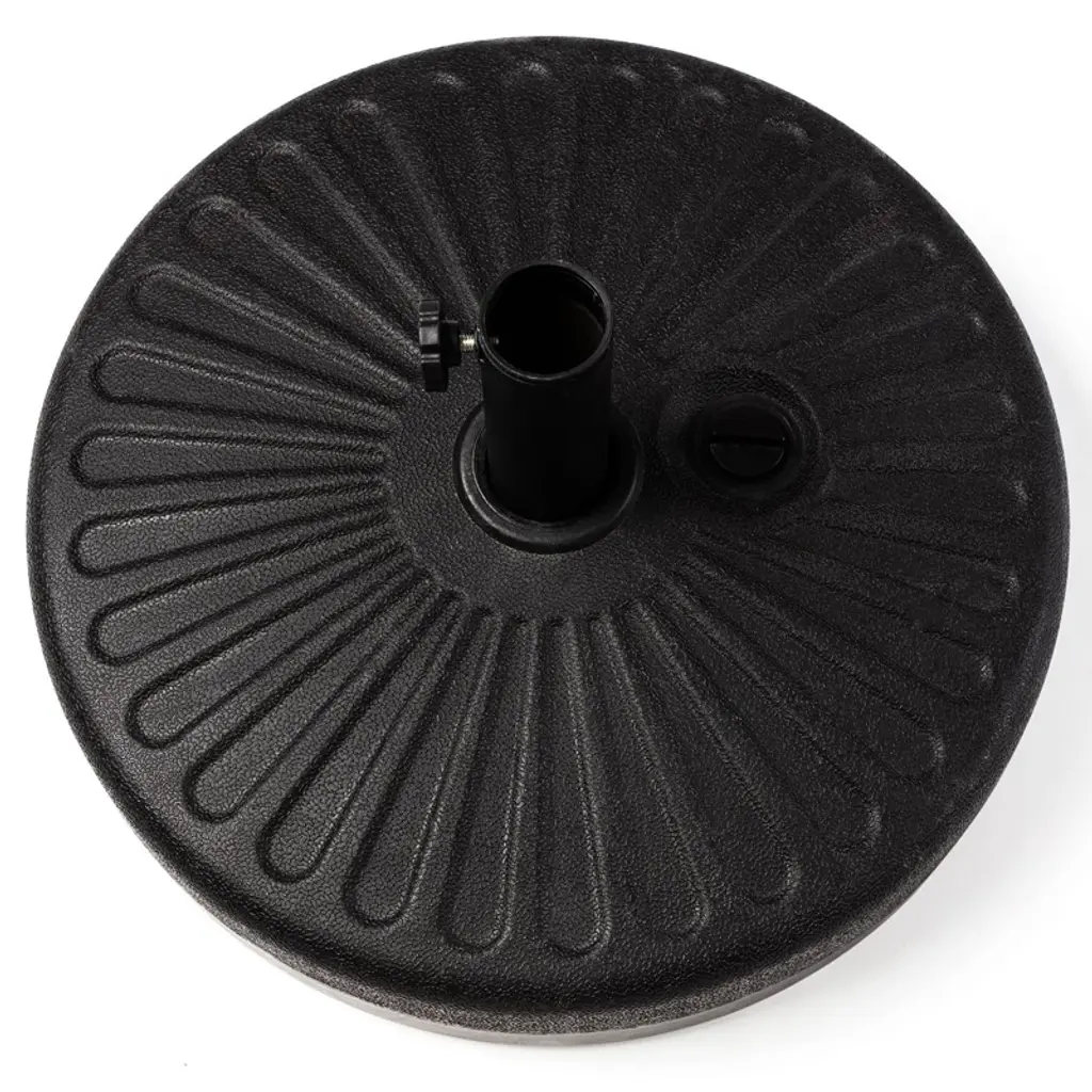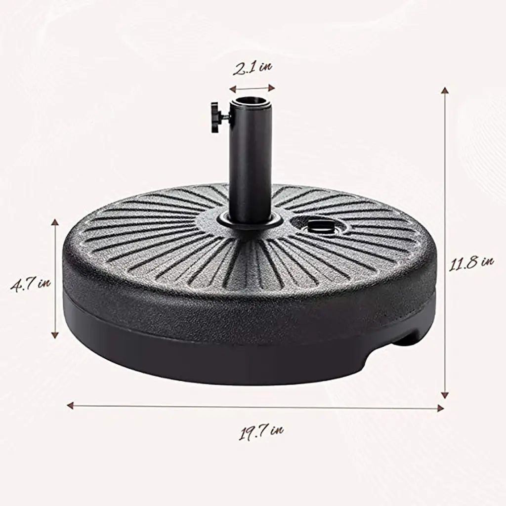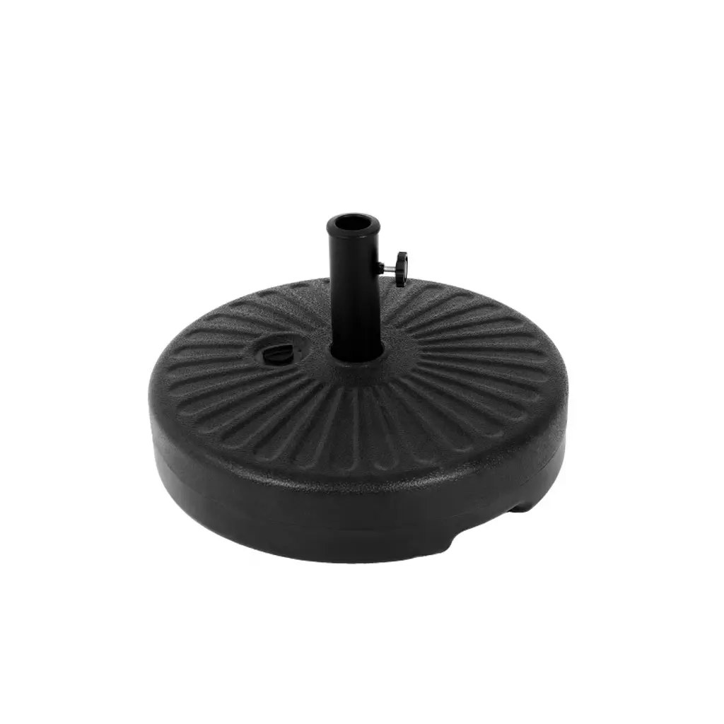 Our 20 in. round 50 lbs. water/sand filled umbrella base is designed to keep your patio umbrella base stable and You don't need to worry any puff of wind which disturbing your Summer relax in the shade. Fill with water/sand for weight. Its low maintenance finishing makes it more lasting and weather resistant.