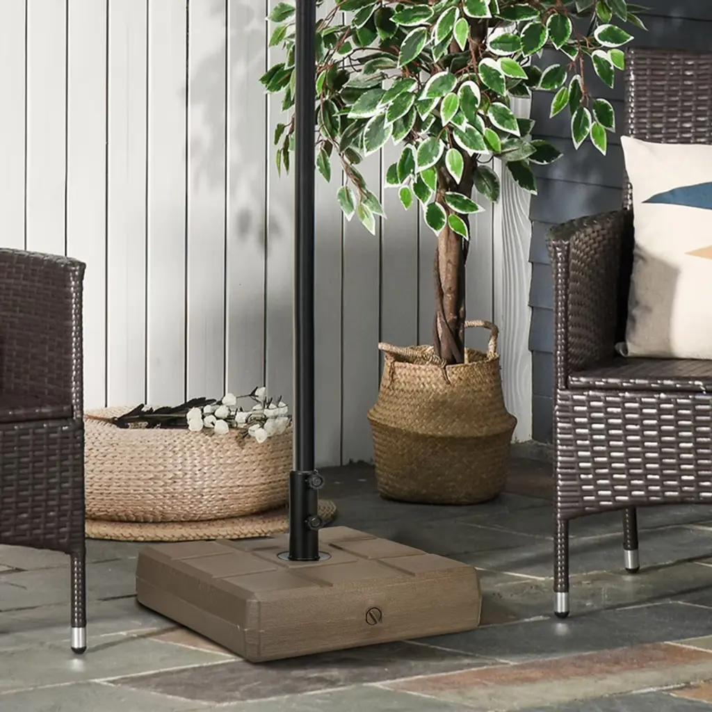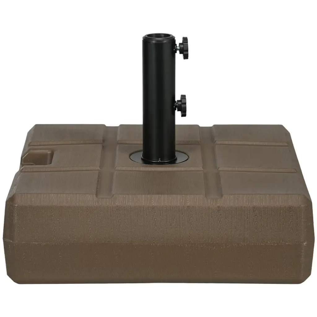 An Outsunny umbrella base doesn't just help your umbrella stand up it adds a delightful accent to your patio. With a large capacity, our fillable umbrella base can weigh up to 66 lbs. when filled with water or 88 lbs. with sand. It's made of all-weather HDPE plastic with two reversible wood patterns. Two knobs secure your umbrella pole in place, allowing it to fit an array of sizes. Also, a handle built into our umbrella base makes it easy to carry when emptied. Get out, get comfy, get Outsunny.