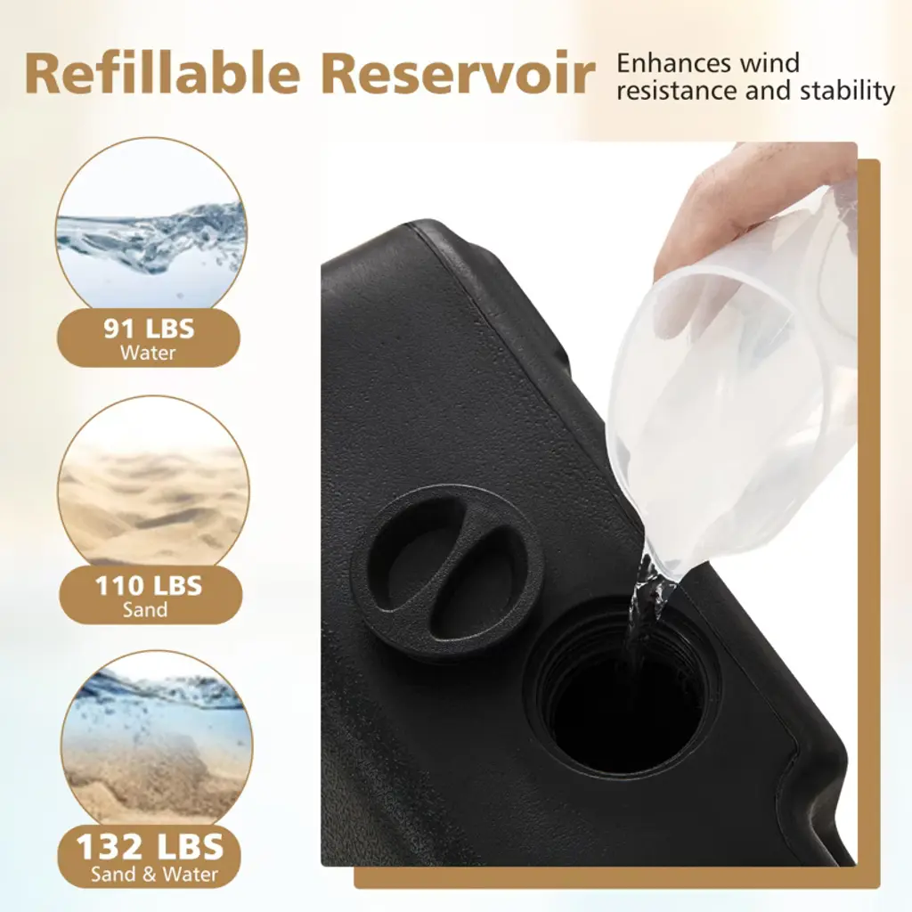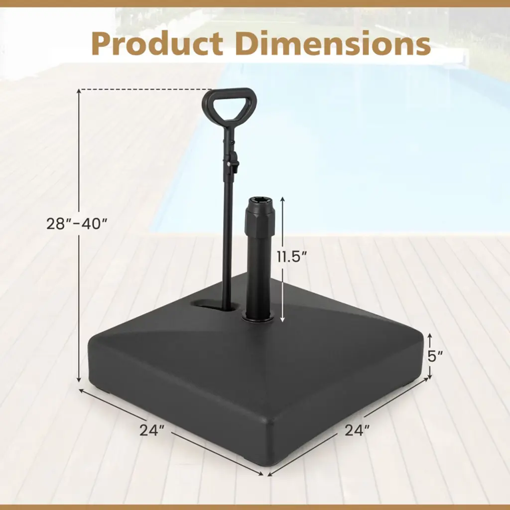 Upgrade your patio with this versatile umbrella base. It fits most 6-10 ft umbrellas with 3 adapters for poles of 1.89", 1.5", and 1.34". The refillable reservoir holds up to 91 lbs, 110 lbs sand, or 132 lbs of both, with a water-sand mix ideal for larger umbrellas. Equipped with three rolling wheels and an adjustable, detachable handle (24"-36"), it moves easily and locks securely by retracting wheels into the base. Made from rust-proof metal pipes and reliable HDPE, this heavy-duty base measures 24" x 24" x 28"-40" (L x W x H), ensuring long-lasting performance and stability.FeaturesEquipped with 3 adapters, this base fits most 6-10 ft umbrellas Refillable reservoir holds 91 lbs water or 110 lbs sand for added stability 3 rolling wheels for easy movement, save your energySpecifications:Color: Black Material: HDPE Product Dimensions: 24" x 24" x 28"-40" (W x D x H) Length of the Retractable Pull Rod: 24"-36" Fill Capacity of the Water: 91 lbs Fill Capacity of the Sand: 110 lbs Fill Capacity of the Water & Sand: 132 lbs Suitable Umbrella Pole Diameters: 1.89"/1.5"/1.34" Net Weight: 16.5 lbs Package Includes: 1 x Patio Umbrella Base 3 x Adapters 1 x User's Manual