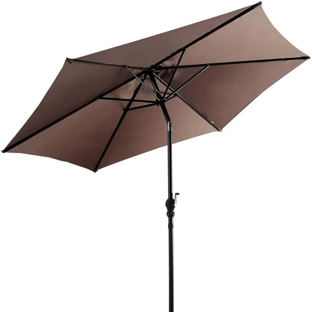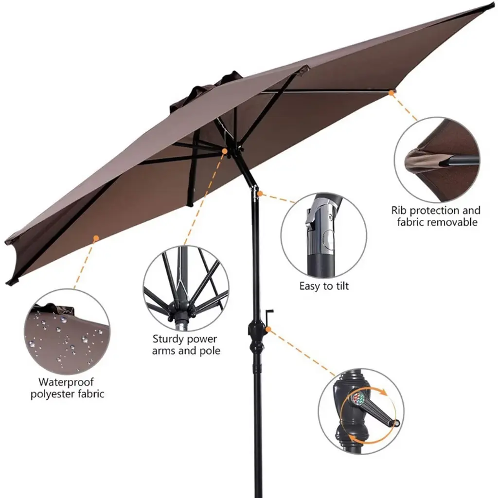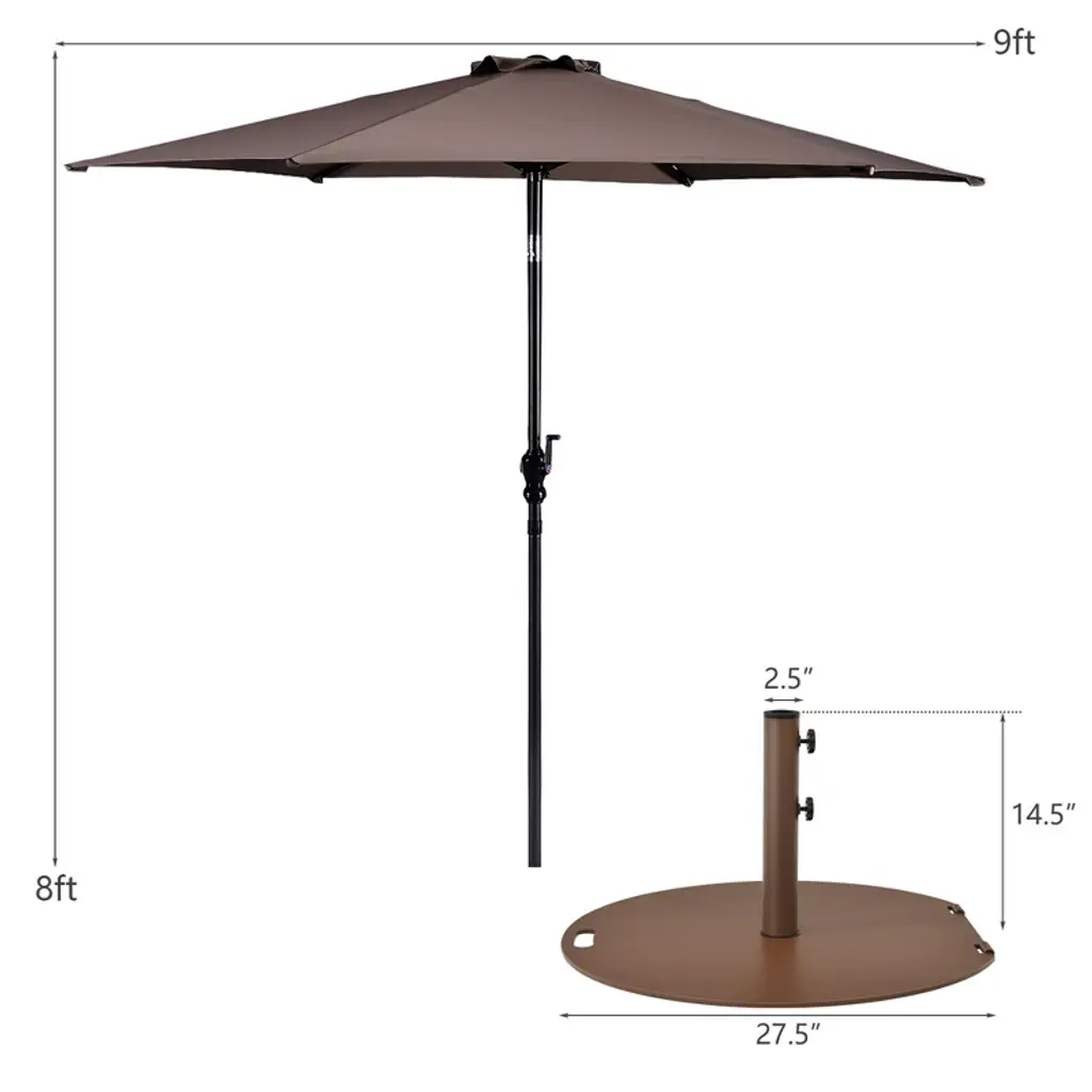 This is our 9ft patio umbrella which will be your ideal companion and can provide all-day shade enjoyment. Made of high-quality polyester cloth and supported by a steel pole and 6 sturdy ribs, our patio umbrella can withstand long-term outdoor use. You can open and close the umbrella effortlessly thanks to its handle crank. And push-button tilting system allows you to adjust the angle of the canopy to block the sun all day long. In addition, the round umbrella base with 50 lbs weight can hold your umbrella securely in place. Enjoy happy outdoor time under our patio umbrella with your family and friends!FeaturesWith a convenient push-button tilt mechanism to freely adjust the canopy angle Handle crank to effortlessly open and close the umbrella in seconds Provides better air circulation with wind vent on the top Equipped with a 50 lbs umbrella base to keep it stableSpecifications:Material: Polyester Cloth + Steel Color: Beige / Red / Tan / Blue / Orange Size of Umbrella: 9' x 8' (Dia x H) Size of Umbrella Stand: 27.5" x 27.5" x 14.5" (L x W x H) Pole Size of Umbrella: 1.5" (Dia) Pole Holder Size for Umbrella Stand: 1.4" / 1.5" / 1.9" Rib Number: 6 Net Weight of Umbrella: 10 lbs Net Weight of Umbrella Stand: 50 lbs Package Includes: 1 x Patio Umbrella 1 x Umbrella Stand 1 x User Guide
