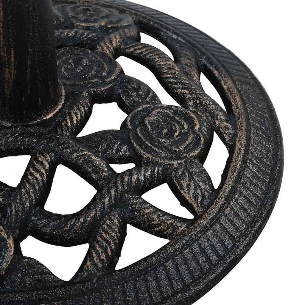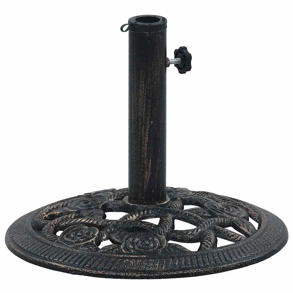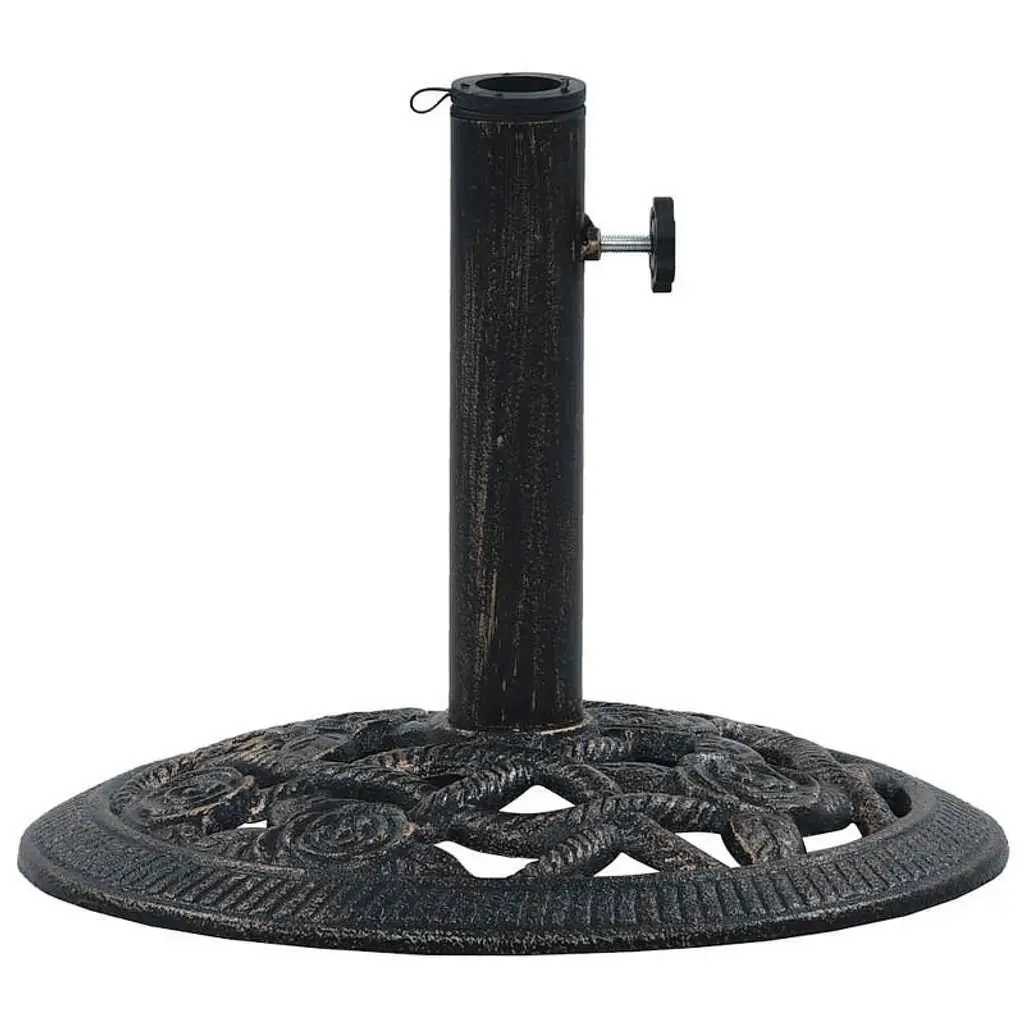 This Cast Iron Umbrella Base mixes style with function, making it a key accessory for your outdoor area. Its attractive black and bronze colors fit right in with any patio decor while giving a steady hold for your patio umbrella, so you can chill in the shade during sunny days or breezy moments.Solid Stability: Weighing 19.8 lbs, this umbrella base is built to handle strong winds, so you can feel secure about your outdoor setup. Perfect for gardens, balconies, or poolside lounging, giving you peace of mind.Stylish Design: The fancy floral pattern on the top adds a nice touch to your outdoor space, making it more visually appealing while staying practical. This well-made base looks great with any outdoor furniture.Easy Maintenance: The matte finish means this umbrella base won’t show fingerprints or marks, making clean-up easy with just a wipe of a dry cloth. Plus, it’s designed to resist wear from the weather.Versatile Compatibility: Made to fit most standard patio umbrellas, it comes with a universal adapter to keep your shade structure stable. This flexibility helps you easily change up your outdoor arrangements.Perfect for Outdoor Living: Great for use on balconies, patios, or pool decks, this umbrella base is designed specifically for outdoor settings, enhancing your leisure time with essential shade for outdoor fun.
