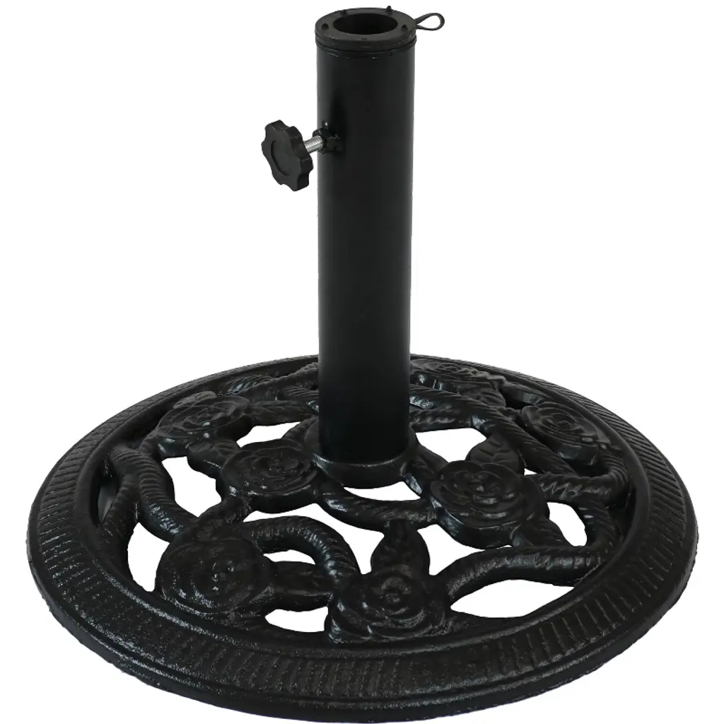 This traditional umbrella base is a solid anchor for any outdoor setup, giving you both stability and style. With its classy bronze finish and floral patterns, it matches any outdoor decor, whether it’s on a balcony or in the garden, making it the perfect choice for both function and flair. Stable Foundation: The robust cast iron build provides excellent weight, stopping tipping and ensuring your umbrellas stay put, even on windy days.Beautiful Aesthetics: The floral design adds a classy touch to any outdoor area.Easy Maintenance: The matte finish makes cleaning easy with just a damp cloth, keeping your umbrella base looking fresh.Versatile Use: Perfect for all types of outdoor umbrellas, this base works in both home and commercial settings.Perfect Dimensions: At 18.9 in across, it takes up little space but gives loads of stability.