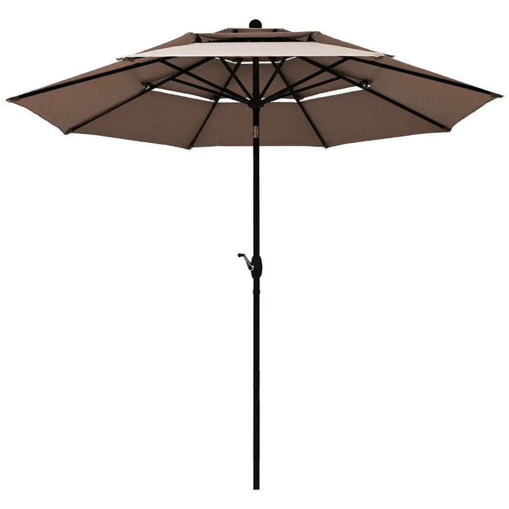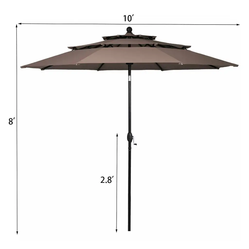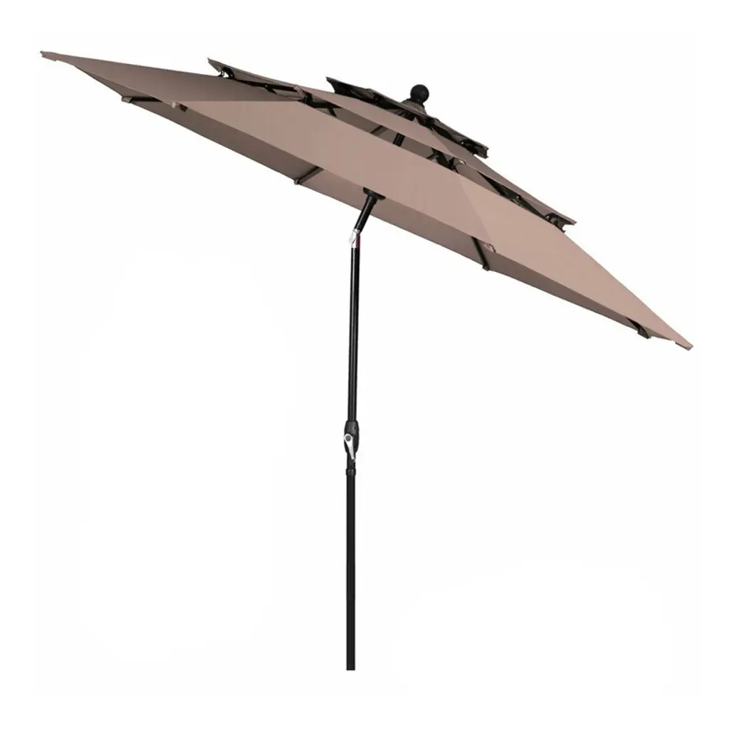 The 10ft 3 Tier Patio Umbrella Canopy is made of high quality durable polyester that effectively blocks the sun's UV rays, is UV resistant and waterproof for easy maintenance. The 3-tier vented top design also adds stability against wind. Just use the built-in crank to open and fold the top. Manual tilt makes it easy to adjust to any angle.
