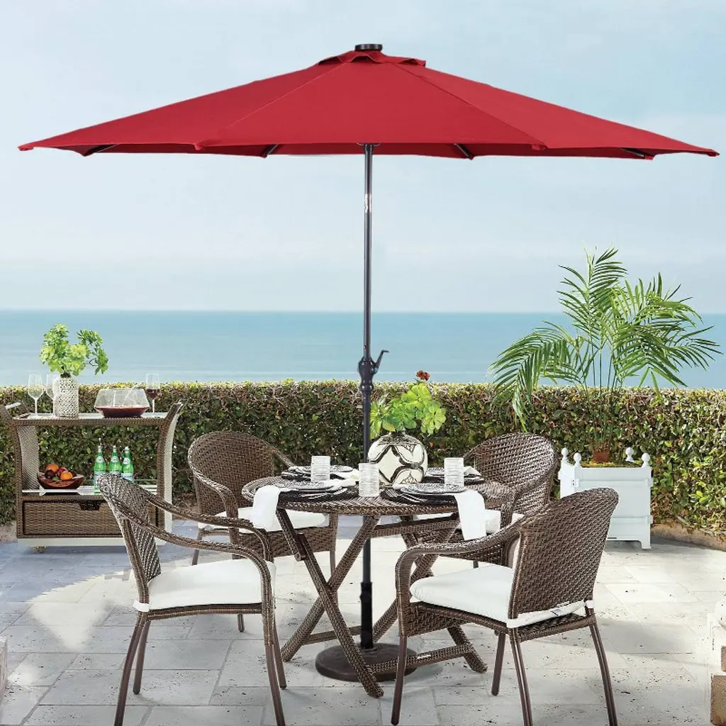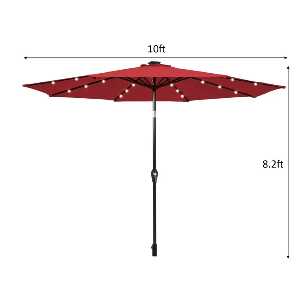 This 10ft patio solar umbrella with crank and LED light is perfect for decorating the area around your house and keeping it with your family. Built-in 24 solar LED lights, can run for 6-7 hours. A 1.5” diameter iron pole and 8 sturdy ribs provide strong support . By the way, the crank allows you to effortlessly open and close the umbrella in seconds. 8.2 ft x10 ft x10 ft (HxWxL)