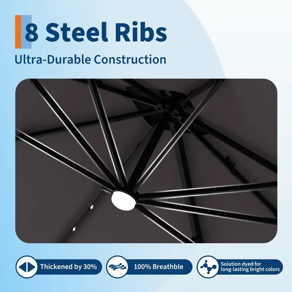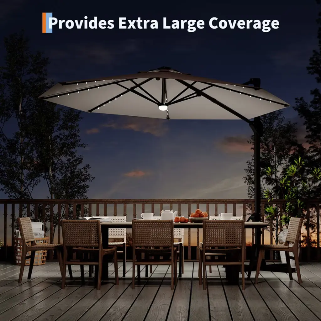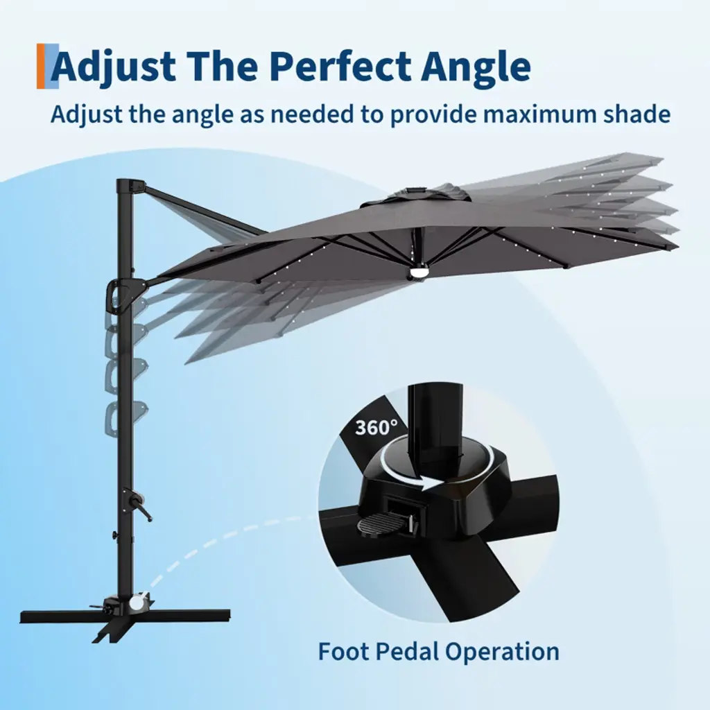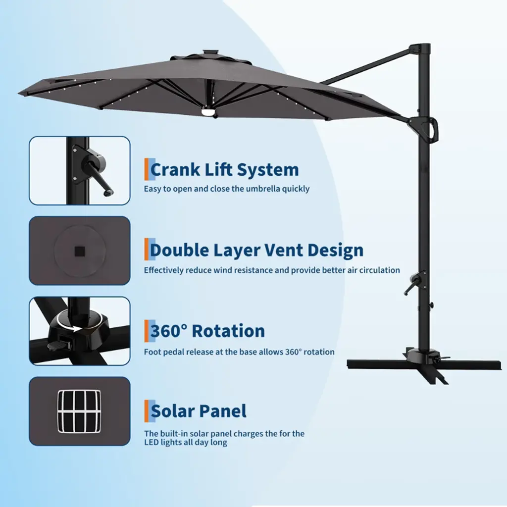 10ft Cantilever Umbrella W/ Solar Lights, 360° Rotation & Tilt, Easy Crank, Uv Protection For Pool, Deck, Backyard-grey