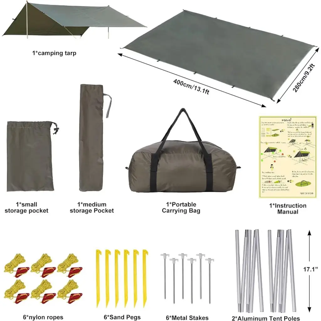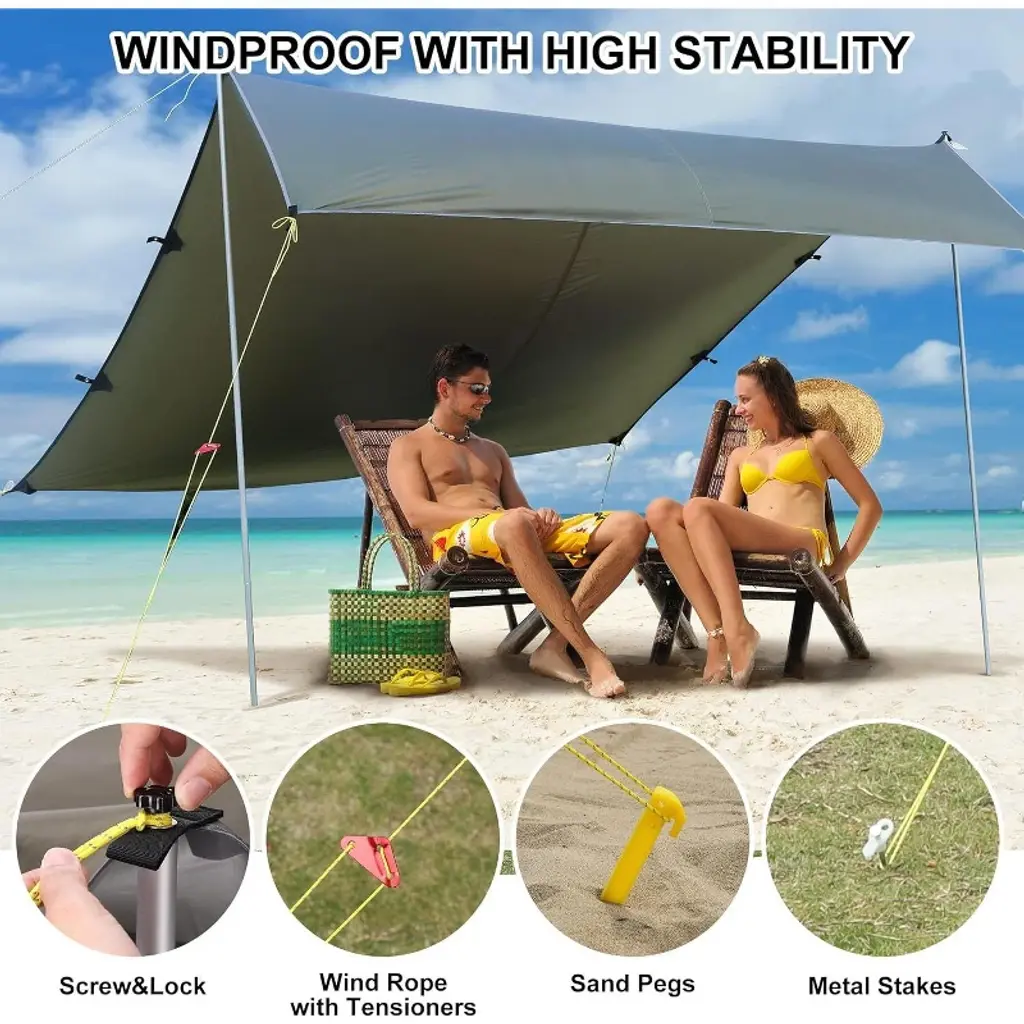 Introducing the 13.1 X 9.2 FT Beach Tent, the sun shelter designed for your outdoor adventures. Crafted from high-quality polyester material, this beach shade canopy offers superior protection against harmful UV rays, ensuring you stay cool and comfortable under the sun. Whether you're at the beach, camping, hiking, or backpacking, this versatile tent is your perfect companion. Featuring a robust waterproof design, the tent provides reliable shelter from unexpected rain, making it ideal for various weather conditions. The included sand pegs ensure stability even on windy days, securing the tent firmly to the ground for a worry-free experience. This lightweight and portable beach umbrella easily pops up for quick setup and folds down compactly into the portable carrying bag, making it effortless to carry and store. Its spacious 10.5 X 9.2 FT size offers ample shade for family and friends, perfect for picnics, outdoor events, or relaxing days by the water. Key Features: - Durable polyester material with waterproof coating for long-lasting use and weather resistance - Easy pop-up design for quick and hassle-free setup - Sand pegs included for enhanced stability on sandy or uneven surfaces - Spacious 10.5 X 9.2 FT canopy provides ample shade for multiple people - Lightweight and compact, fits conveniently in the included carrying bag for portability - Multi-purpose use: ideal for beach trips, camping, hiking, backpacking, and other outdoor activities Experience the perfect blend of convenience, durability, and protection with this beach tent. Whether you're seeking shelter from the sun or a waterproof cover during your outdoor excursions, this tent has got you covered. Elevate your outdoor experience with the 10.5 X 9.2 FT Beach Tent – your reliable sun shelter and beach shade canopy.