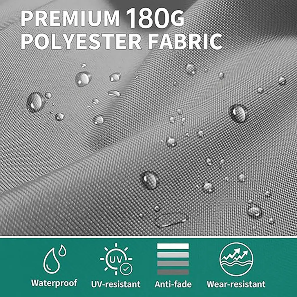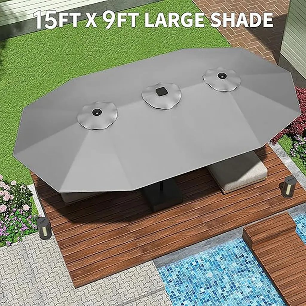 Spacious Coverage:Dimensions: 15 ft long x 9 ft wide x 7.8 ft highIdeal for providing shade for a 6-person table, ensuring comfort during social gatherings and outdoor dining. Convenient Assembly:Easy to set up by simply inserting the umbrella pole into a compatible base or patio table.User-friendly crank handle allows for effortless opening and closing of the umbrella. Durable Construction:Made with heavy-duty 180g polyester fabric that is waterproof, breathable, and UV-resistant.Features three air vents that enhance airflow and stability, keeping the umbrella secure during breezy conditions. Sturdy Frame:Constructed with 12 rust-proof steel ribs and a coated steel pole for a robust and stable structure.Two-section umbrella arms are designed for excellent wind resistance, providing peace of mind during outdoor use. Versatile Base Size:Base dimensions of 29” x 29”, with a pole size of 1.9”, allowing compatibility with most existing tables and bases on the market.