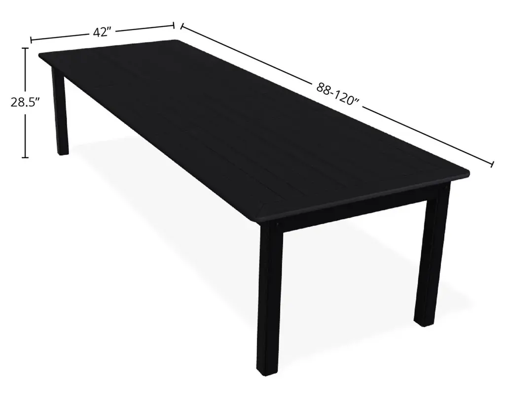 Marine Grade Polymer Top Tables combine modern design with unmatched durability for outdoor living. With options in coffee, chat, dining, accessory, balcony, and bar heights, they offer versatility for any setting. Sleek lines and sharp angles create a clean, contemporary look, while marine-grade polymer surfaces resist cracking, rotting, and water damage. Built to last, these tables are a practical and stylish choice for outdoor spaces.Features:Overall product dimensions are 42" W x 88" D x 28.5" HDurable marine grade polymer resists cracking, rotting, and water damage, inside and outHigh-quality 100% stainless steel hardwareSlat design ensures durability, water drainage, and a sleek lookLow-maintenance and easy to cleanAvailable in multiple color variationsProudly made in the USA with over a century of craftsmanship since 1903Dimensions:Dining TableAssembled Product: 42 inches wide x 88 inches deep x 28.5 inches highMax Depth: 120 inchesMin Depth: 88 inchesWeight Capacity: 350 poundsMax Extension Length: 120 inches