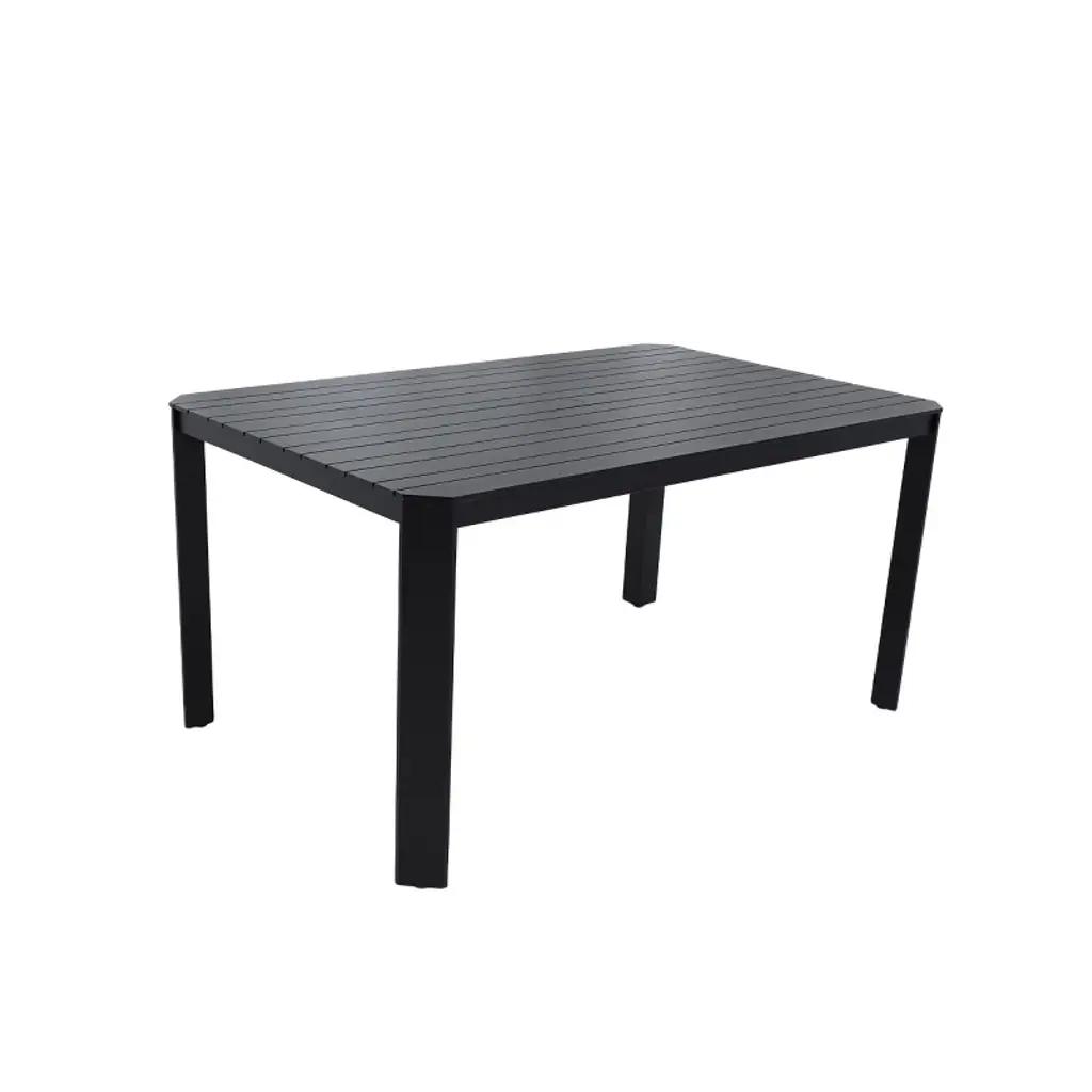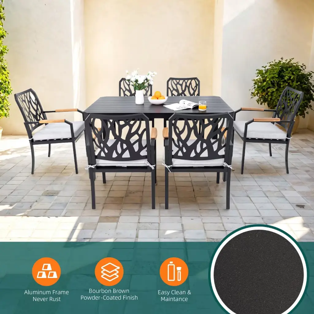 Elevate your outdoor dining space with the Koiai 59'' Modern Aluminum Patio Table, designed to blend sleek aesthetics with lasting durability. Crafted from high-grade rust-resistant aluminum, this table is lightweight yet robust, offering a strong frame that’s easy to move and built to resist the elements. Its Bourbon Brown powder-coated finish adds a sophisticated matte texture while enhancing weather resistance for year-round use. This patio table features a frameless tabletop with alternating wide and narrow aluminum slats, precisely spaced to allow drainage and airflow while delivering a dynamic, modern look. The flush, flat surface offers a clean and contemporary alternative to traditional uniform slats, making it a standout piece for any outdoor setting. Designed with both safety and sophistication in mind, the tabletop includes refined 45° angled corners that soften its profile while maintaining sharp structural integrity. These angles are echoed in the triangular cross-section post legs, creating visual harmony and additional strength. The result is a table that’s as stable as it is stylish, perfect for patios, balconies, poolside spaces, or gardens. A 2-inch umbrella hole adds versatility, allowing you to pair it with your favorite patio umbrella for shaded lounging or dining. The included aluminum cover keeps the table sleek when the hole isn’t in use. Adjustable non-slip foot pads ensure stability on uneven surfaces and help protect flooring from scratches, so you can enjoy peace of mind on any surface. Whether you're hosting outdoor dinners or enjoying quiet mornings with coffee, this 59 inch aluminum dining table with umbrella hole delivers performance and design in one striking package.