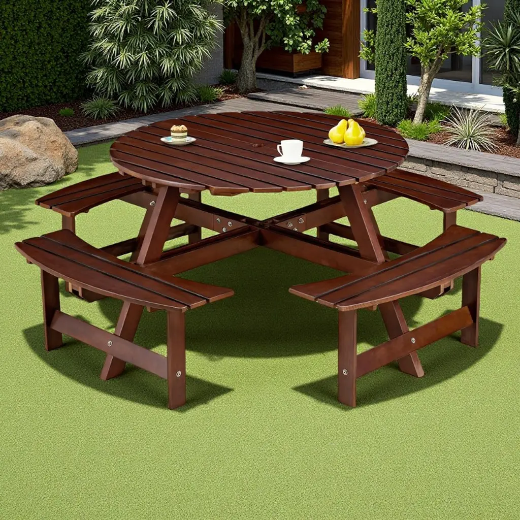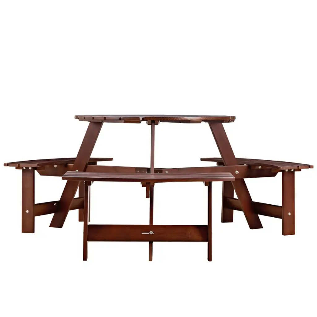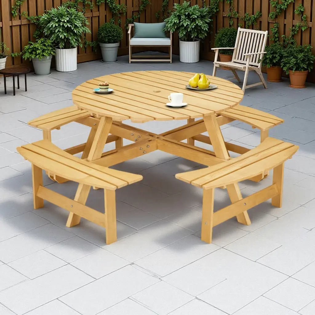Perfect for outdoor dining and entertaining, this round wooden picnic table with three integrated benches combines functionality, comfort, and rustic charm. Designed to comfortably seat up to six people, it’s a great choice for your patio, backyard, garden, or poolside gatherings. Product Features Durable, Weather-Resistant Wood: Constructed from burr-free, weather-resistant wood that’s built to endure the elements for long-lasting use. Each bench supports up to 500 lbs, making it ideal for everyday outdoor seating.Seating for 6 People: Features three spacious built-in benches arranged around the round table, offering comfortable seating for up to six people with ample legroom.2-Inch Umbrella Hole: A convenient 2" hole in the center of the tabletop is compatible with most standard patio umbrellas (umbrella not included), providing shade and comfort during sunny or rainy weather.Rustic Wood Grain Design: The natural wood finish adds a charming, rustic aesthetic to any outdoor space—perfect for casual meals, picnics, or social events.Waterproof & Easy to Clean: The tabletop has a waterproof surface that wipes clean with ease, making maintenance simple and stress-free. Design Details 3 Built-in Benches: Comfortably accommodate up to six people for outdoor meals and activities.Smooth, Safe Edges: The burr-free construction enhances safety and comfort for all users.Multi-Season Use: Suitable for use in various weather conditions, thanks to its waterproof finish and umbrella compatibility. Bring family and friends together in style and comfort with this versatile round picnic table—designed for lasting outdoor enjoyment.