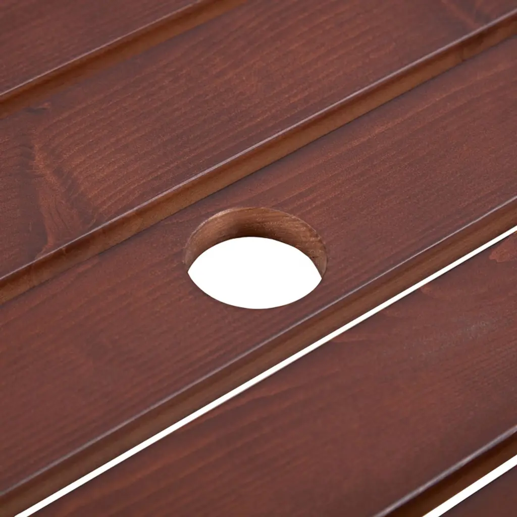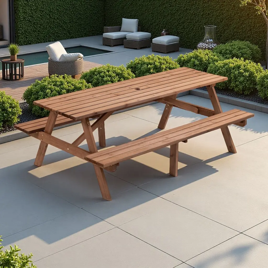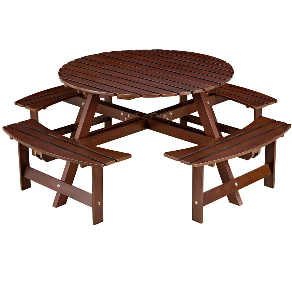 Perfect for outdoor dining and entertaining, this round wooden picnic table with three integrated benches combines functionality, comfort, and rustic charm. Designed to comfortably seat up to six people, it’s a great choice for your patio, backyard, garden, or poolside gatherings. Product Features Durable, Weather-Resistant Wood: Constructed from burr-free, weather-resistant wood that’s built to endure the elements for long-lasting use. Each bench supports up to 500 lbs, making it ideal for everyday outdoor seating.Seating for 6 People: Features three spacious built-in benches arranged around the round table, offering comfortable seating for up to six people with ample legroom.2-Inch Umbrella Hole: A convenient 2" hole in the center of the tabletop is compatible with most standard patio umbrellas (umbrella not included), providing shade and comfort during sunny or rainy weather.Rustic Wood Grain Design: The natural wood finish adds a charming, rustic aesthetic to any outdoor space—perfect for casual meals, picnics, or social events.Waterproof & Easy to Clean: The tabletop has a waterproof surface that wipes clean with ease, making maintenance simple and stress-free. Design Details 3 Built-in Benches: Comfortably accommodate up to six people for outdoor meals and activities.Smooth, Safe Edges: The burr-free construction enhances safety and comfort for all users.Multi-Season Use: Suitable for use in various weather conditions, thanks to its waterproof finish and umbrella compatibility. Bring family and friends together in style and comfort with this versatile round picnic table—designed for lasting outdoor enjoyment.