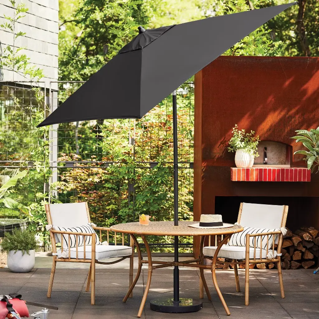 Equip your outdoor space for bright sunny days with this Square Outdoor Patio Market Umbrella with Black Pole from Threshold™. This outdoor umbrella is a must-have addition to your patio, deck, backyard or garden decor. Made of fade-resistant fabric canopy for lasting outdoor use, its solid color makes it easy to coordinate with a range of outdoor settings, and it's equipped with a push-up lift system that makes it easy to raise and lower the canopy along with push-button tilt for more shading angles.Threshold™: Looks like home, feels like you.