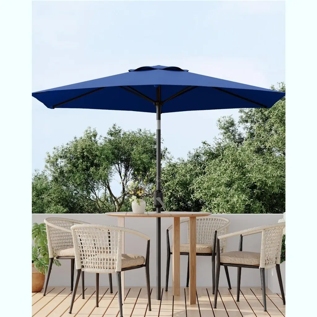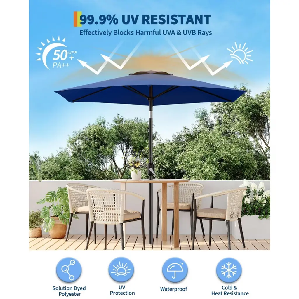 Product DescriptionEnhance outdoor comfort with this versatile 7.5-foot patio umbrella featuring advanced tilt-crank operation and commercial-grade durability. Engineered for decks, pools, and gardens, its weather-resistant construction delivers reliable sun protection while offering multiple fade-resistant color options to suit diverse outdoor settings.Key Features1. Robust Weatherproof ConstructionHeavy-gauge iron frame outperforms aluminum alternatives with 30% greater wind resistance6 reinforced structural ribs with corrosion-resistant coating endure coastal humidity and seasonal extremesIntegrated wind vent reduces canopy stress during gusts2. Precision Sun ManagementUPF 50+ certified 240g polyester blocks 99.9% UV radiationHydroshield finish repels rain and inhibits mildew formationFade-resistant technology maintains color integrity for 3+ seasons3. Ergonomic Adjustment SystemSingle-action crank handle deploys canopy smoothly in under 10 secondsPush-button tilt mechanism offers 5-angle positioning for continuous shade alignmentCollapsed height optimized for compact storage4. Multi-Surface Adaptability90-inch diameter shelters 4-6 seat dining sets or lounge groupingsStandard 1.5-inch pole fits most commercial patio table bases5. Simplified InstallationTool-free assembly with pre-installed hardware componentsPowder-coated finish resists chipping and scratchesProduct SpecificationsDiameter: 7.5 ft (90 inches)Frame: Reinforced iron with fiberglass rib tipsCanopy: 240g UPF 50+ polyesterMechanism: Rotary crank + 5-position tiltPole Diameter: 1.5 inchesColor Options: Multiple fade-resistant variants availableWind Resistance: Vented canopy designIdeal for permanent patio installations or seasonal use, this umbrella combines salon-grade UV protection with customizable aesthetics¡ªavailable in multiple durable colors to complement garden furniture, pool decks, or backyard retreats.