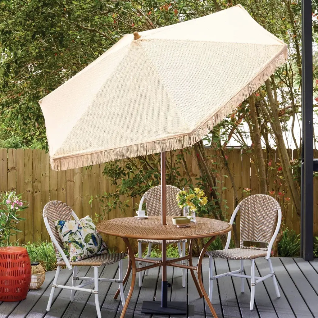 Stay comfortable by blocking out direct sun with this Hexagon Macrame Outdoor Patio Market Umbrella from Threshold™. Supported on a rust-resistant metal frame, this outdoor market umbrella features a hexagonal canopy made from soft fabric for helping you stay cool under the sun. Featuring a push-up lift type and equipped with a push-button tilt for more angles of shading, it features a macrame design in a beige hue with a fringed hem in white to add artistic flair to your patio, balcony or porch. Plus, it comes with a bag for easy carrying.Threshold™: Looks like home, feels like you.