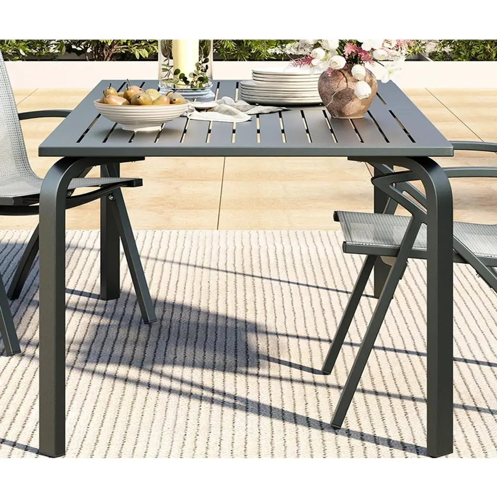 This outdoor aluminum dining table offers a spacious and durable design, perfect for patio or deck use. Measuring 70.9" x 35", it provides ample space for meals and gatherings. The slatted tabletop design ensures efficient drainage, making it ideal for outdoor conditions. Crafted from aluminum, it's both stable and water-resistant, withstanding scratches and easy to clean. The table's height is 29", providing comfortable seating for most outdoor chairs. Its sleek, modern look complements any outdoor decor.