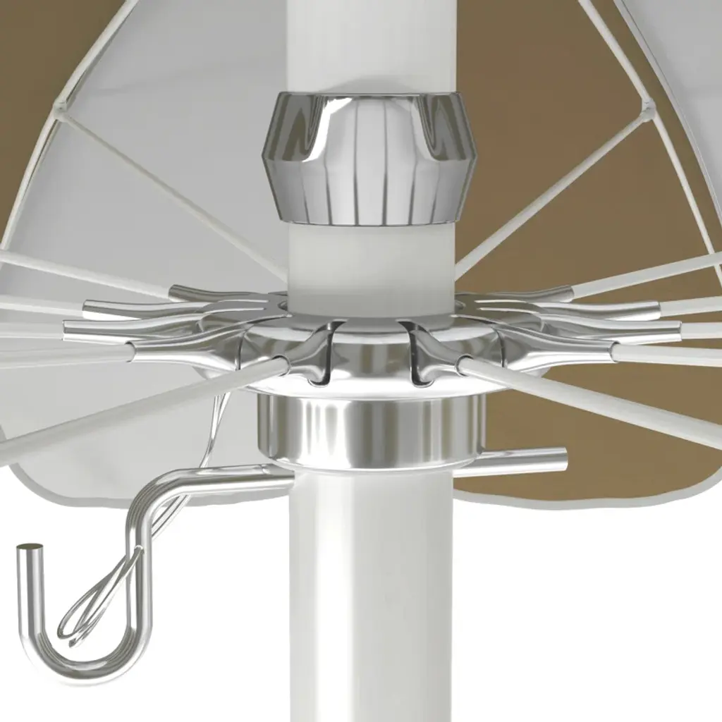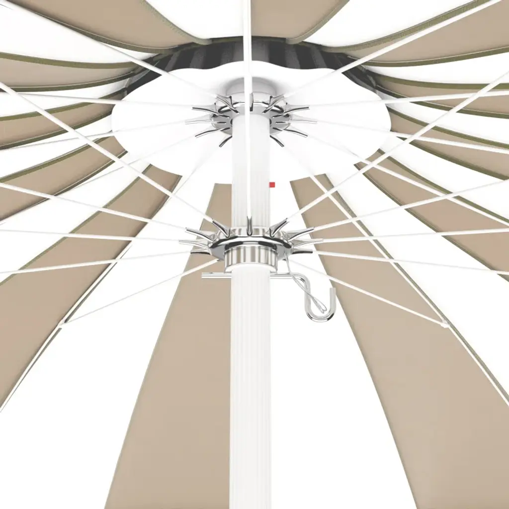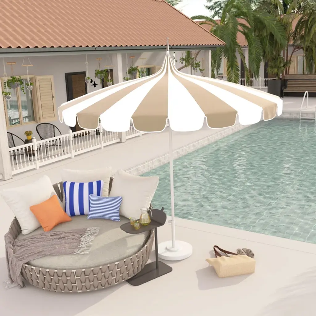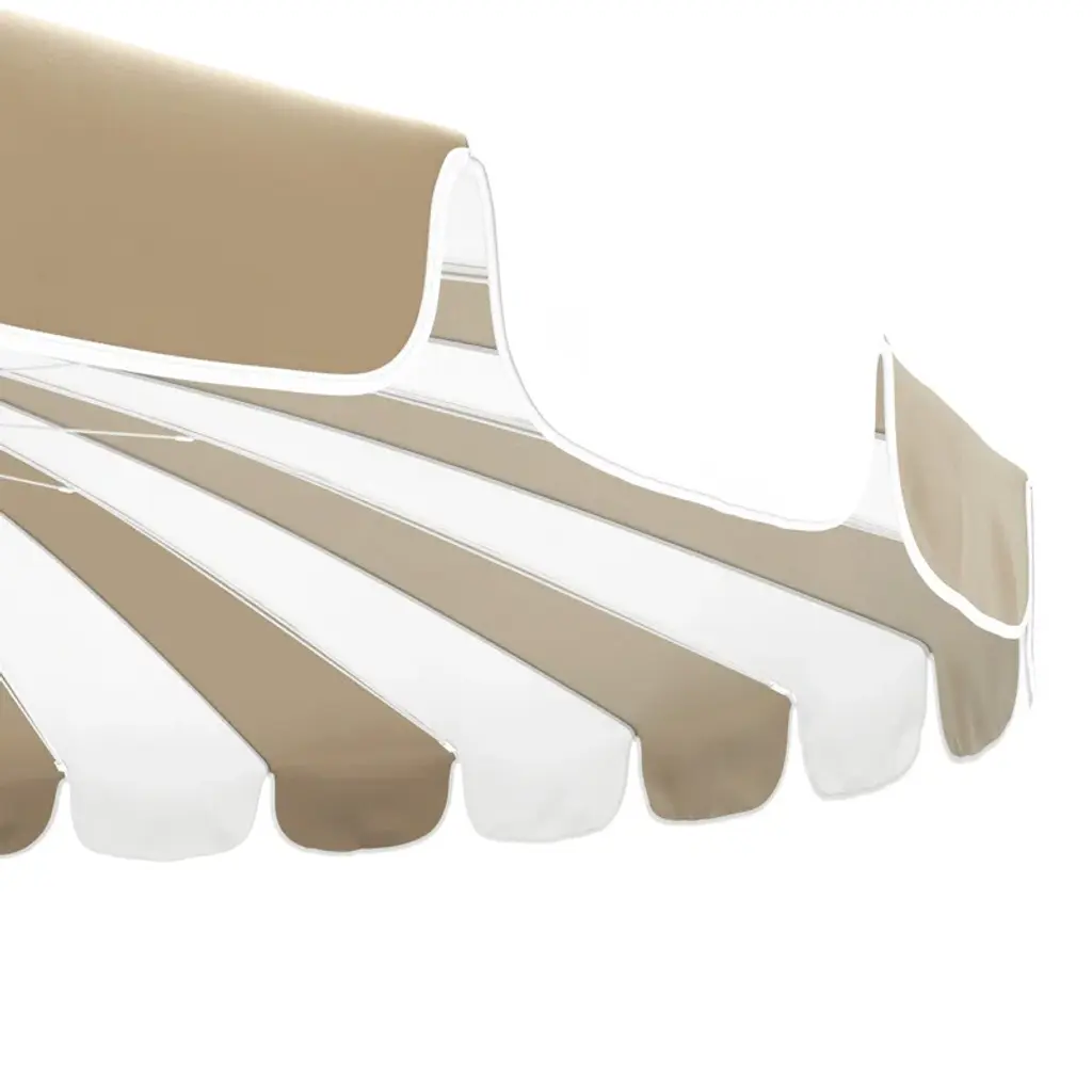 Searching for patio shade that offers chic style in addition to long-lasting performance? Look no further than this unique patio umbrella design! The vintage-inspired silhouette of this pagoda-style umbrella makes it a distinctive and perfect addition to any outdoor space. Its white aluminum center pole brightens the space around it while also providing sturdy support for the opened umbrella, while the flexible fiberglass ribs offer improved wind resistance for worry-free relaxation under your shade. The two-toned canopy features alternating panels that drape across the twelve ribs, leading to a gently scalloped valance with a decorative white trim outlining each curve. Plus, the beautiful fabric is composed of Sunbrella’s solution-dyed acrylic fibers that are known for their durability and resistance to mold, mildew, staining, and fading, ensuring that it can withstand the elements better than other fabrics. Whether you're relaxing in your backyard or enjoying a meal on your patio, this sophisticated umbrella is the ideal choice to add elegant style and protective shade to your outdoor space all day long!
