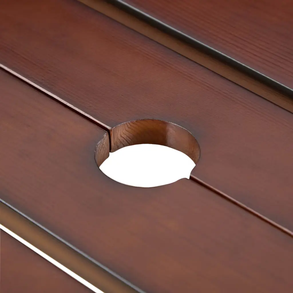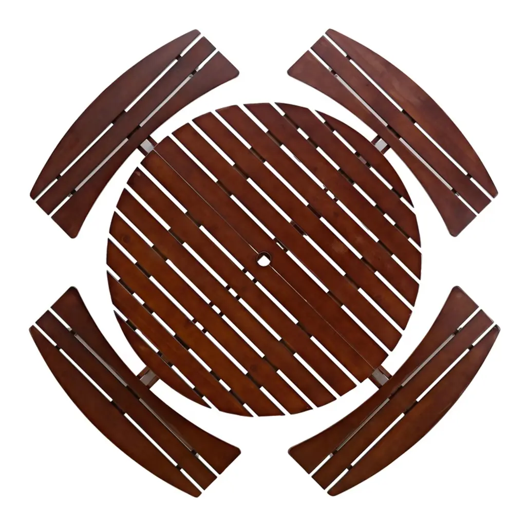 This classic round picnic table combines rustic charm and practical design to create the perfect gathering spot for outdoor meals, parties, and relaxation. With seating for up to 8 people, it's ideal for patios, backyards, gardens, and more. Product Features Durable & Weather-Resistant Wood: Made from burr-free, weather-resistant wood, this picnic table offers lasting durability and can support up to 500 lbs per bench for reliable outdoor use.Seating for Up to 8 People: Includes four built-in benches with generous space, allowing up to 8 adults to sit comfortably. Extra legroom ensures a relaxed dining experience.Convenient Umbrella Hole: The center of the tabletop features a 2" umbrella hole compatible with most standard patio umbrellas (umbrella not included), so you can enjoy shade and comfort while dining outdoors.Rustic Aesthetic: With its natural wood grain design, this picnic table adds a charming, rustic touch to any outdoor setting—ideal for the patio, poolside, garden, or backyard.Waterproof & Easy to Maintain: The smooth, waterproof surface is easy to clean, making upkeep simple even after messy outdoor meals or rainy weather. Design Highlights 4 Built-in Benches: Provide sturdy and spacious seating.Smooth Edges: Burr-free finish ensures safety and comfort.Multi-Season Use: Suitable for both sunny and rainy days with the built-in umbrella hole. Create memorable moments with family and friends with this beautifully crafted and functional round wooden picnic table.