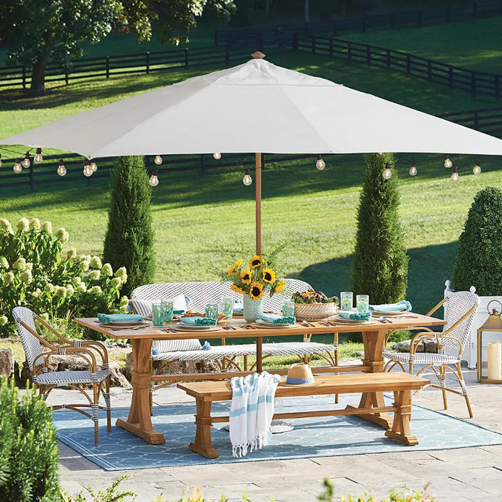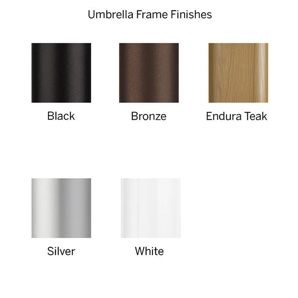 Our Market Umbrella provides the finest protection under the sun while allowing you to personalize your outdoor space. With more than 60 canopy options, two frame materials (aluminum or teak) and five aluminum frame finishes, you can easily create the perfect umbrella for your open-air decor. Each canopy blocks skin-damaging UV rays, while resisting dirt and mildew. All frames are outfitted with stainless steel hardware. Canopy: Sunbrella® acrylic fabric All fabrics are 100% Sunbrella®, except for Rumor Snow, Rumor Stone, Rumor Vanilla, Rumor Slate and Rumor Indigo Sunbrella® fabrics awarded the Seal of Recommendation by The Skin Cancer Foundation for providing up to 98% UV protection Resists fading, stains, mold, dirt and mildew Vented canopy allows hot air to circulate Spot clean with mild soap and water Allow wet canopy to dry in an open position before closing Frame and Pole: Aluminum frame Over 60 canopy options Finish options: Bronze, Black, White, Silver and faux-wood Endura-Teak Endura-Teak frame is aluminum with a faux-wood finish, for a teak look that won't patina over time Features a classic crank operation Scratch- and rust-resistant Teak frame Over 60 canopy options Finish options: Natural Teak and Weathered Teak Features an easy-to-use double-pulley opening system Does not tilt Will develop a lovely silver patina with age if left untreated Stainless steel hardware 1-1/2-inch diameter pole Treat areas subject to turning and sliding with a nonstaining, silicone-based lubricant spray Can be used freestanding in a 100+ lb. base when pairing with a larger table, or with a 50 lb. base when pairing with a smaller table Assembly instructions Additional Information: Canopy and frame ship separately Base sold separately When not in use, close and cover umbrella with a protective cover (not included) Imported A Frontgate exclusive. At Frontgate, our primary focus is quality. We guarantee that every product we sell will stand up to the supreme test – our customers' satisfaction. To learn more about our policies, visit our Shipping & Processing, Returns & Exchanges and Warranty & Price Guarantee pages. Our Market Umbrella provides the finest protection under the sun while allowing you to personalize your outdoor space. With more than 60 canopy options, two frame materials (aluminum or teak) and five aluminum frame finishes, you can easily create the perfect umbrella for your open-air decor. Each canopy blocks skin-damaging UV rays, while resisting dirt and mildew. All frames are outfitted with stainless steel hardware. Canopy: Sunbrella® acrylic fabric All fabrics are 100% Sunbrella®, except for Rumor Snow, Rumor Stone, Rumor Vanilla, Rumor Slate and Rumor Indigo Sunbrella® fabrics awarded the Seal of Recommendation by The Skin Cancer Foundation for providing up to 98% UV protection Resists fading, stains, mold, dirt and mildew Vented canopy allows hot air to circulate Spot clean with mild soap and water Allow wet canopy to dry in an open position before closing Frame and Pole: Aluminum frame Over 60 canopy options Finish options: Bronze, Black, White, Silver and faux-wood Endura-Teak Endura-Teak frame is aluminum with a faux-wood finish, for a teak look that won't patina over time Features a classic crank operation Scratch- and rust-resistant Teak frame Over 60 canopy options Finish options: Natural Teak and Weathered Teak Features an easy-to-use double-pulley opening system Does not tilt Will develop a lovely silver patina with age if left untreated Stainless steel hardware 1-1/2-inch diameter pole Treat areas subject to turning and sliding with a nonstaining, silicone-based lubricant spray Can be used freestanding in a 100+ lb. base when pairing with a larger table, or with a 50 lb. base when pairing with a smaller table Assembly instructions Additional Information: Canopy and frame ship separately Base sold separately When not in use, close and cover umbrella with a protective cover (not included) Imported A Frontgate exclusive. At Frontgate, our primary focus is quality. We guarantee that every product we sell will stand up to the supreme test – our customers' satisfaction. To learn more about our policies, visit our Shipping & Processing, Returns & Exchanges and Warranty & Price Guarantee pages.