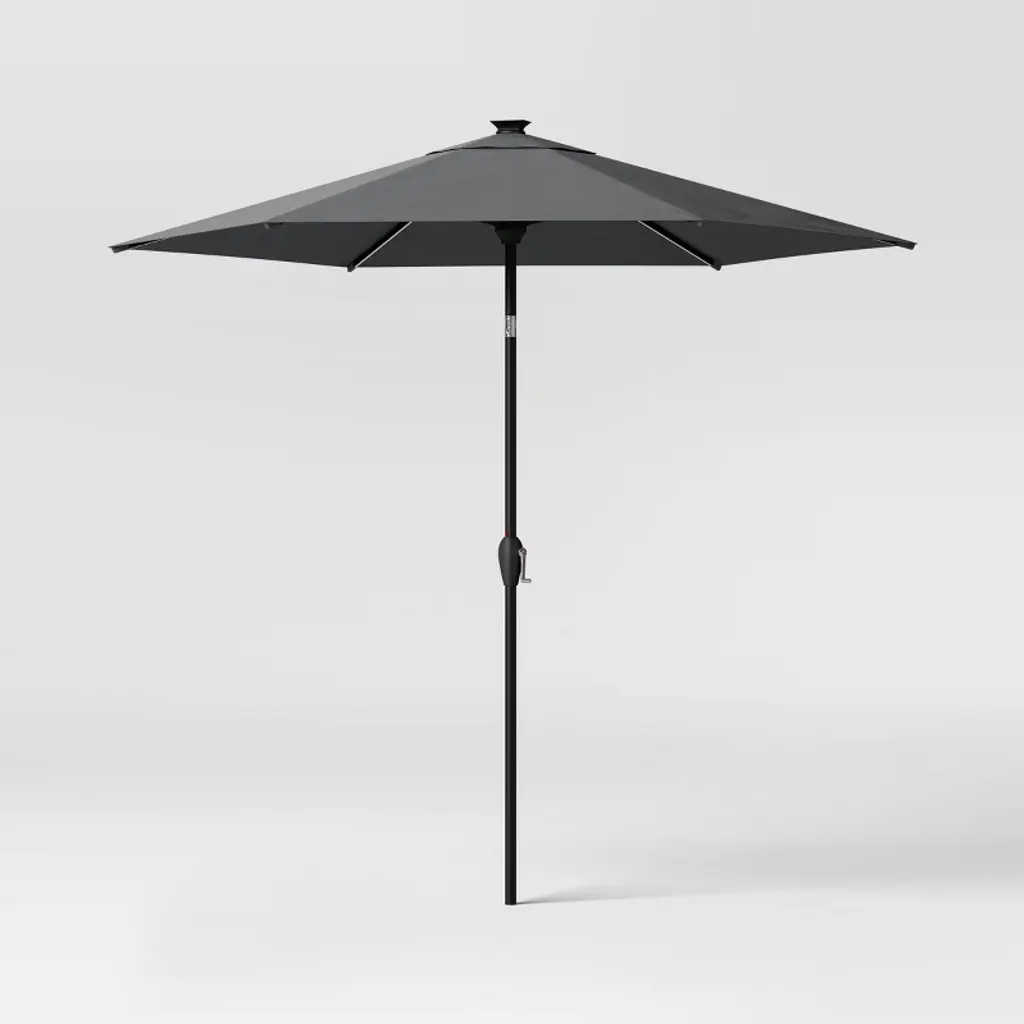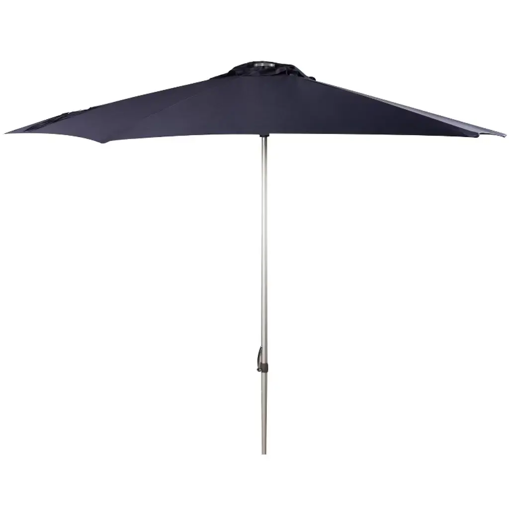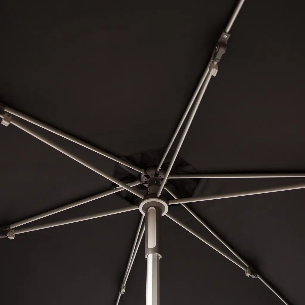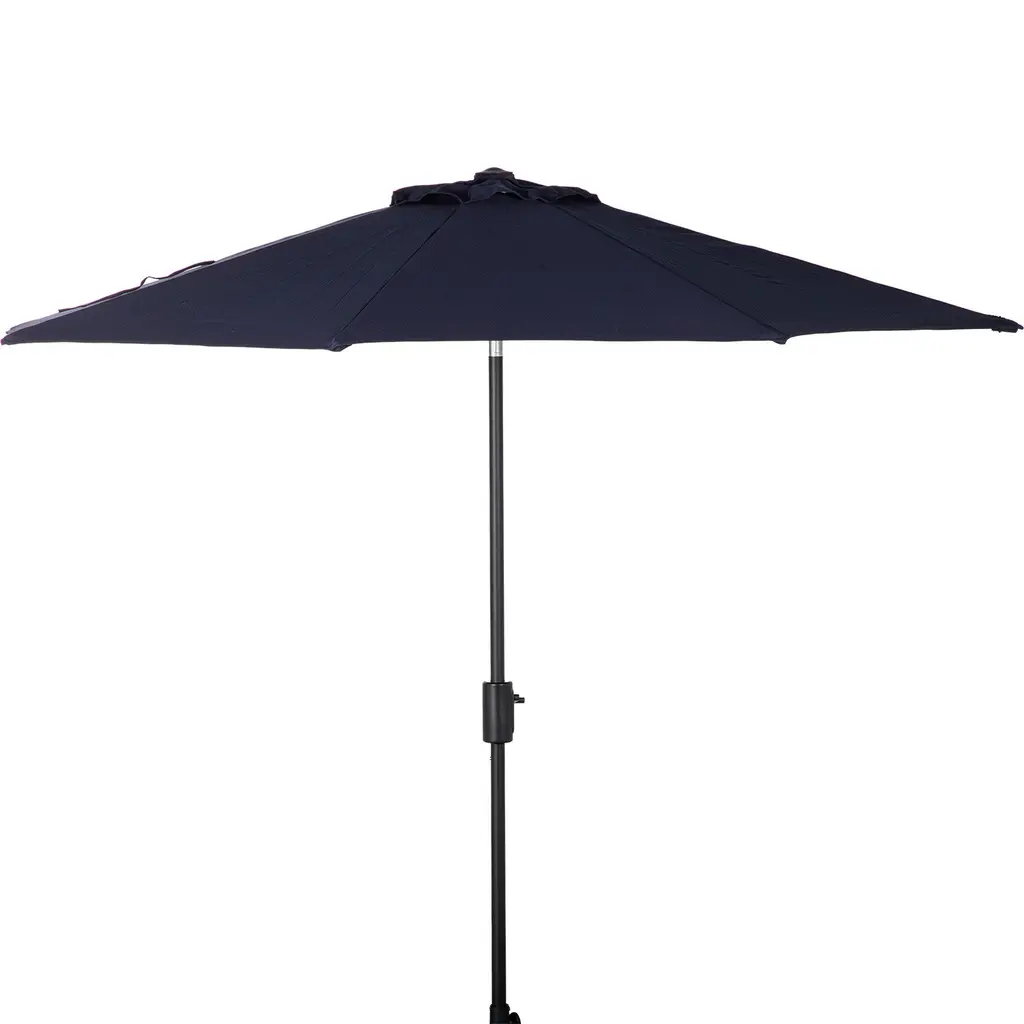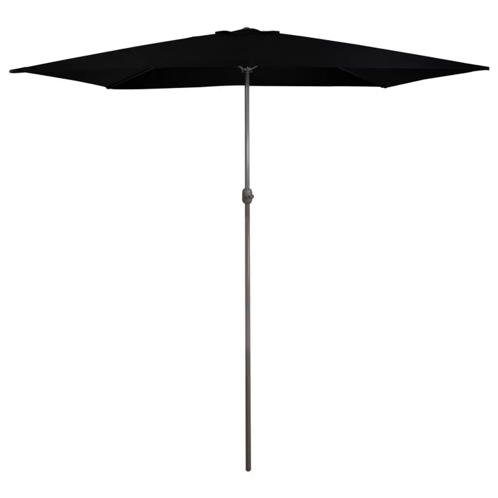 Create a shady oasis on the patio or poolside with this push-up umbrella in the style used in Europe everywhere from farmer’s markets to posh hotels. This classic design features a nine-foot polyester canopy in black and brown aluminum and steel frame. Includes easy glide mechanism. Store outdoor furniture indoors or cover well when not in use. Remove wooden furniture from standing water. Dust regularly with small brush or vacuum. Spills should be taken care of immediately before they harden or stain with a slightly dampened sponge. Do not use bleach solutions. Some assembly required.