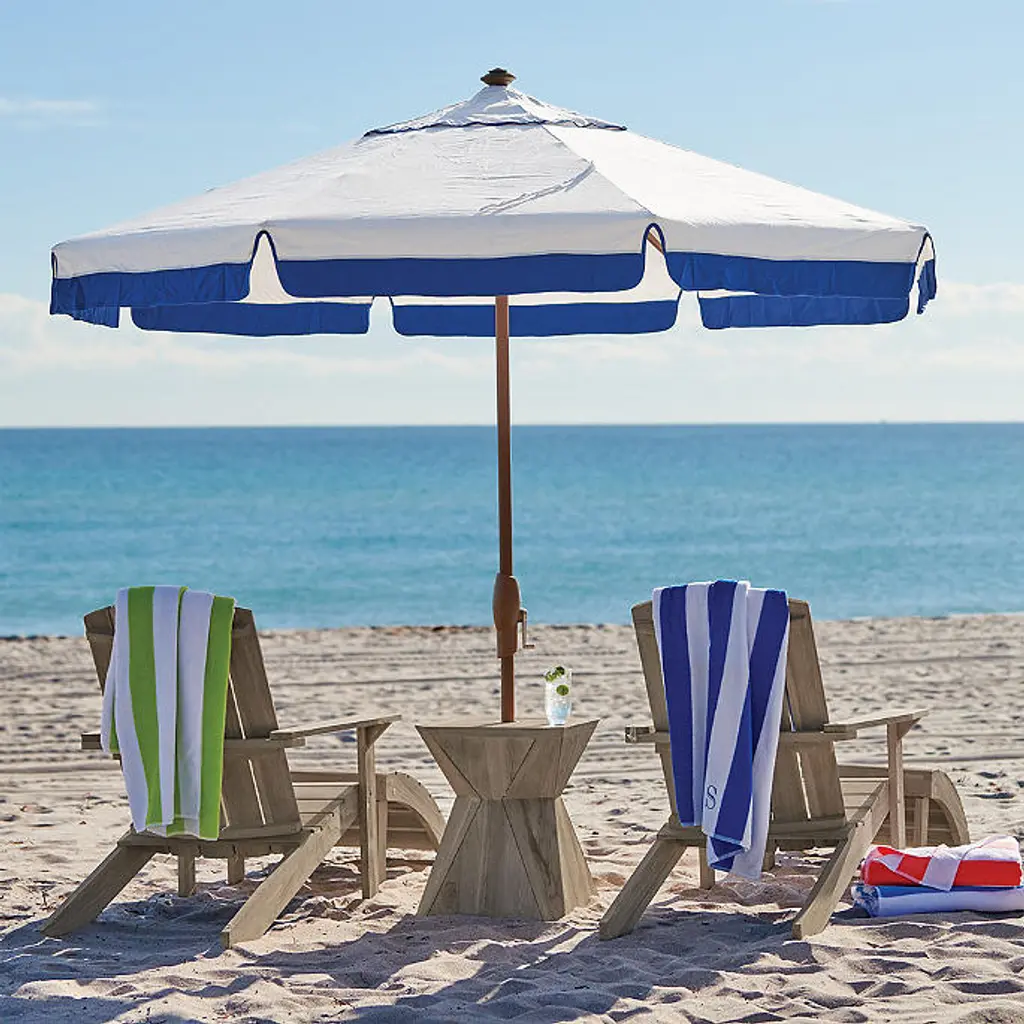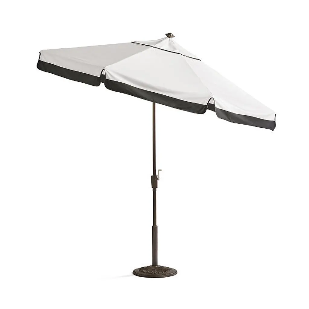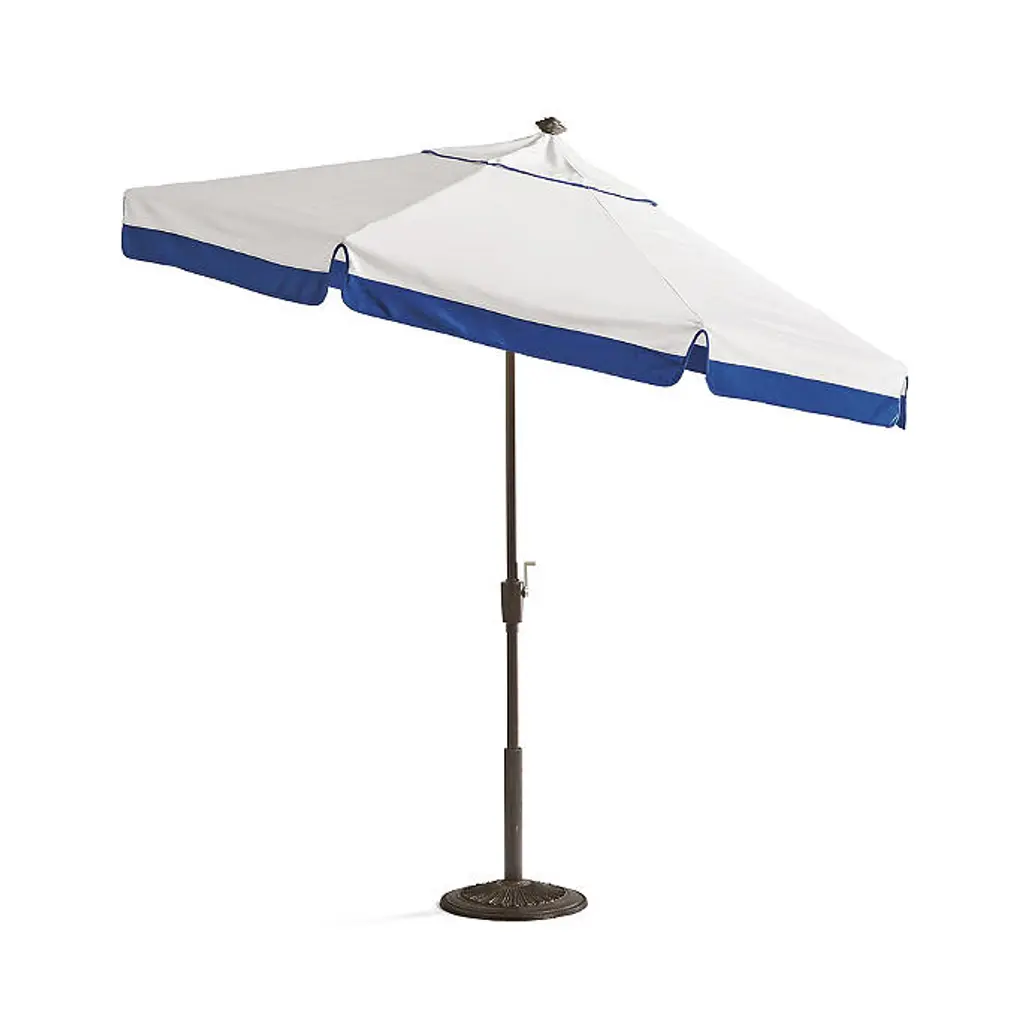 A clean, classic contrasting border highlights this designer umbrella with ideal sun protection. Features vibrant 100% Sunbrella® fabric in alternating color patterns that won't fade, providing 98% UV protection. An easy-to-open pulley system and tilt option make these umbrellas a cut above the rest. Canopy has contrast piping on the valance. Canopy: 100% Sunbrella® solution-dyed acrylic fabric Awarded the Seal of Recommendation by the Skin Cancer Foundation for providing up to 98% UV protection Resists fading, stains, mold, dirt and mildew Vented canopy allows hot air to circulate Spot clean with mild soap and water Allow wet canopy to dry in an open position before closing Frame and pole: Frame available in aluminum and teak, each in multiple finish options Teak frame features an easy-to-use double-pulley opening system Teak frame will develop a lovely silver patina with age if left untreated Aluminum frame is scratch- and rust-resistant Aluminum frame is fitted with a classic crank operation and an auto-tilt function Stainless steel hardware 1-1/2-inch-diameter pole Treat areas subject to turning and sliding with a nonstaining, silicone-based lubricant spray Pole fits an outdoor table, umbrella side table or free-standing base Assembly required Additional Information: Always close umbrella when not in use and in inclement weather Base sold separately Simple assembly Spot clean with mild soap and water When not in use, close and cover umbrella with a protective cover (not included) Canopy and frame ship separately Imported At Frontgate, our primary focus is quality. We guarantee that every product we sell will stand up to the supreme test – our customers' satisfaction. To learn more about our policies, visit our Shipping & Processing, Returns & Exchanges and Warranty & Price Guarantee pages.