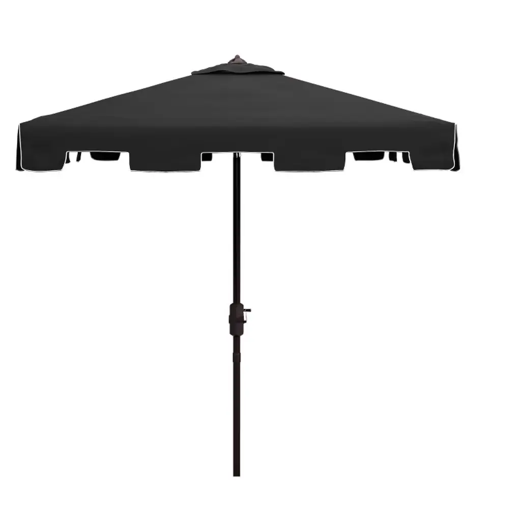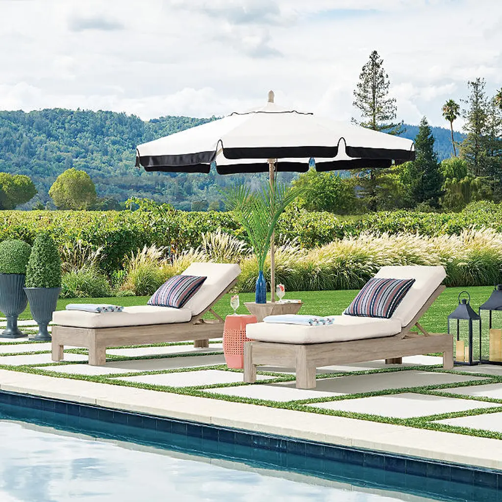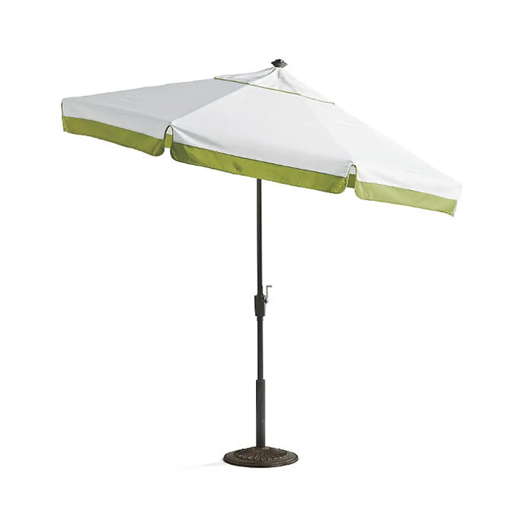 A clean, classic contrasting border highlights this designer umbrella with ideal sun protection. Features vibrant 100% Sunbrella® fabric in alternating color patterns that won't fade, providing 98% UV protection. An easy-to-open pulley system and tilt option make these umbrellas a cut above the rest. Canopy has contrast piping on the valance. Canopy: 100% Sunbrella® solution-dyed acrylic fabric Awarded the Seal of Recommendation by the Skin Cancer Foundation for providing up to 98% UV protection Resists fading, stains, mold, dirt and mildew Vented canopy allows hot air to circulate Spot clean with mild soap and water Allow wet canopy to dry in an open position before closing Frame and pole: Frame available in aluminum and teak, each in multiple finish options Teak frame features an easy-to-use double-pulley opening system Teak frame will develop a lovely silver patina with age if left untreated Aluminum frame is scratch- and rust-resistant Aluminum frame is fitted with a classic crank operation and an auto-tilt function Stainless steel hardware 1-1/2-inch-diameter pole Treat areas subject to turning and sliding with a nonstaining, silicone-based lubricant spray Pole fits an outdoor table, umbrella side table or free-standing base Assembly required Additional Information: Always close umbrella when not in use and in inclement weather Base sold separately Simple assembly Spot clean with mild soap and water When not in use, close and cover umbrella with a protective cover (not included) Canopy and frame ship separately Imported At Frontgate, our primary focus is quality. We guarantee that every product we sell will stand up to the supreme test – our customers' satisfaction. To learn more about our policies, visit our Shipping & Processing, Returns & Exchanges and Warranty & Price Guarantee pages.