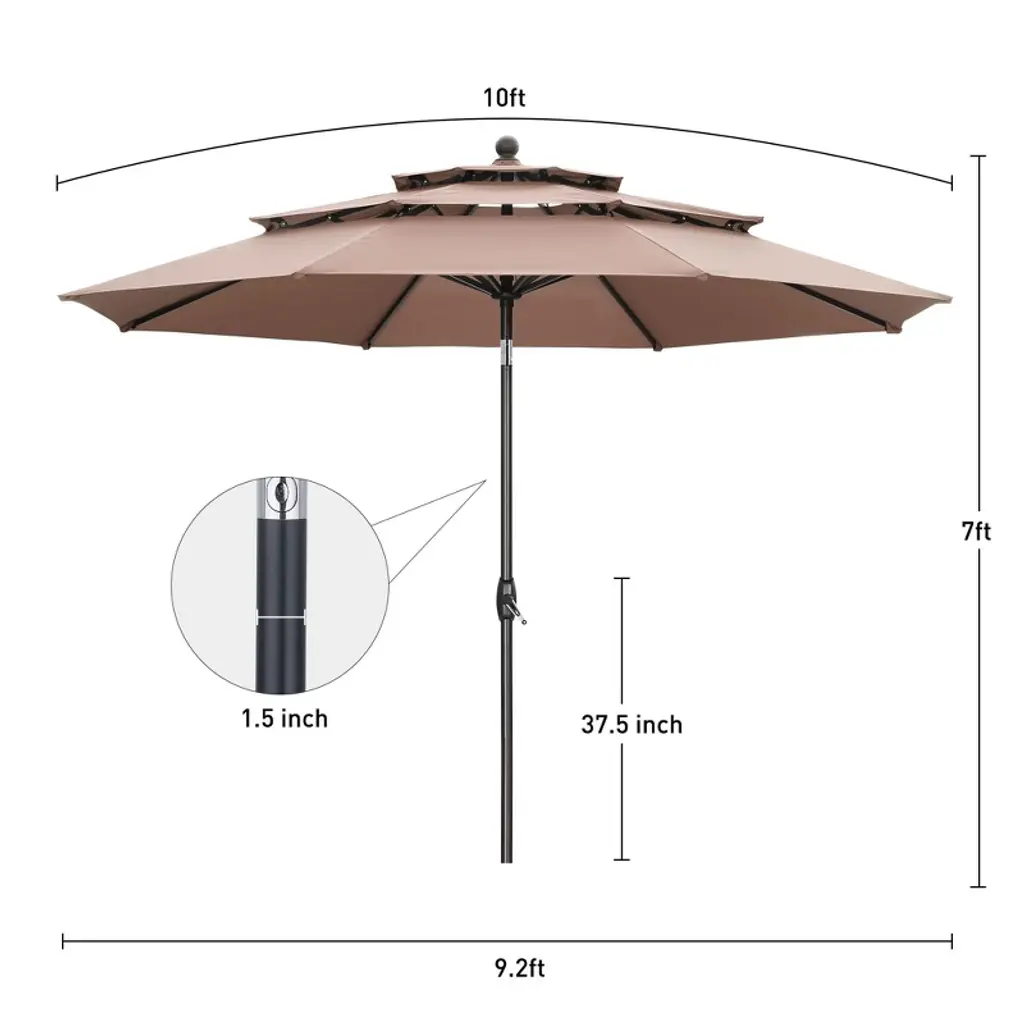 Color:Coffee; Material of umbrella:18g polyester; Type: 3-Tier Umbrella Dimetre umbrella pole:Φ1.5inch ; Qty of umbrella rib:8; Tilt: Yes Crank:Yes