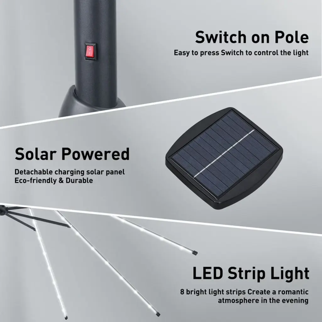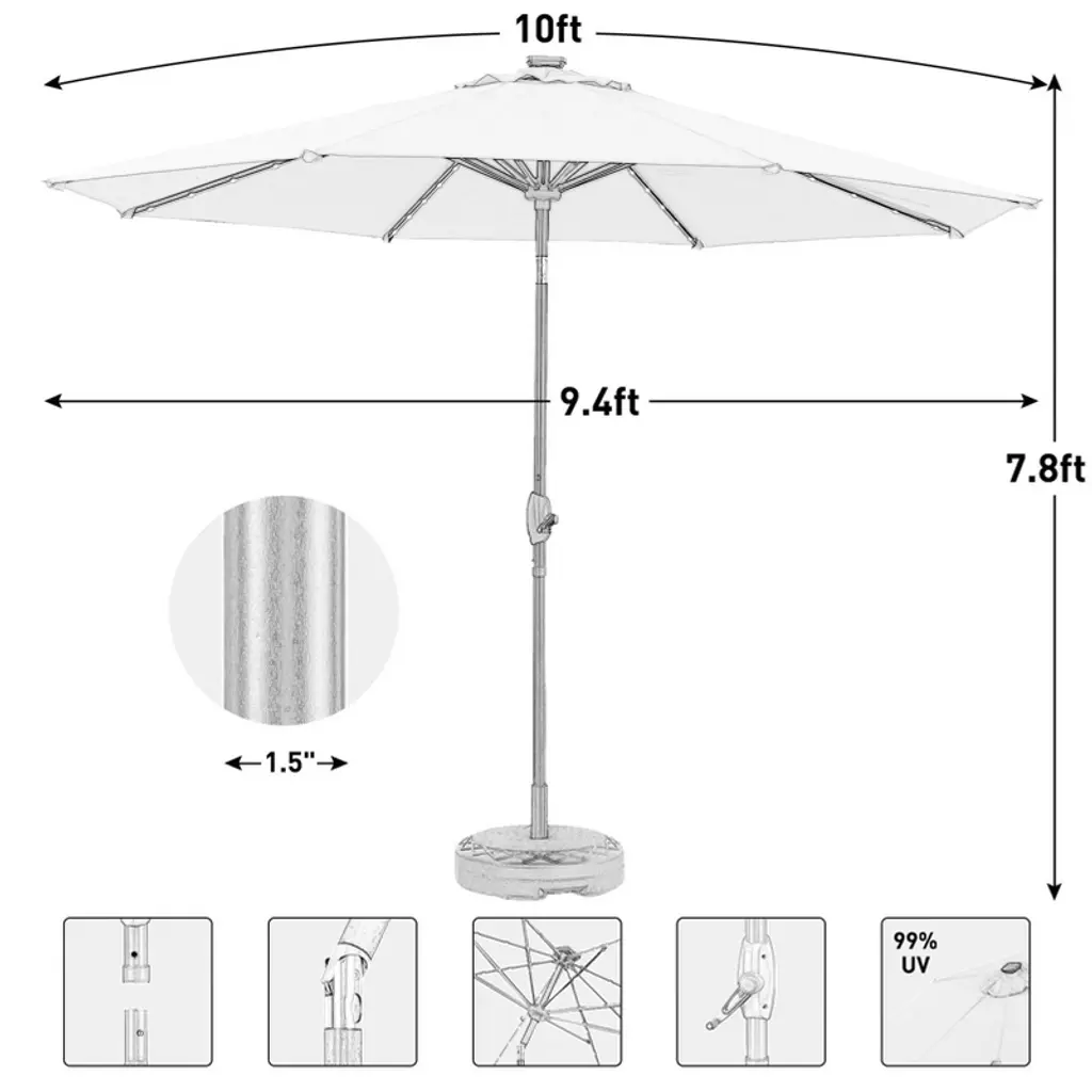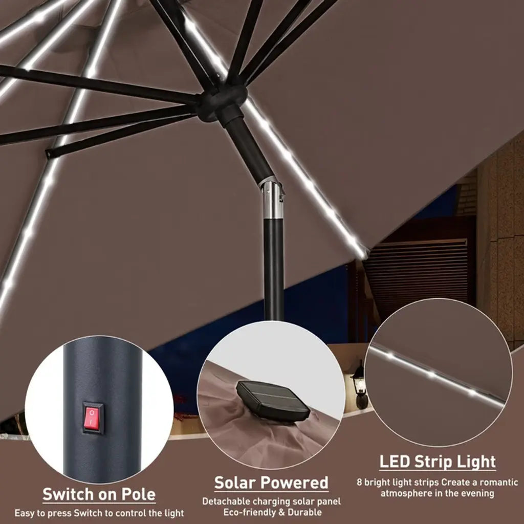Color: Coffee; Material of umbrella:18g polyester; Dimetre umbrella pole:Φ1.5inch ; Qty of umbrella rib:8; Qty of Led lights:64; Size of solar panel:4.72”L * 4.53”W *1.22”H; Power of solar panel:1.2W; Tilt: Yes Crank:Yes