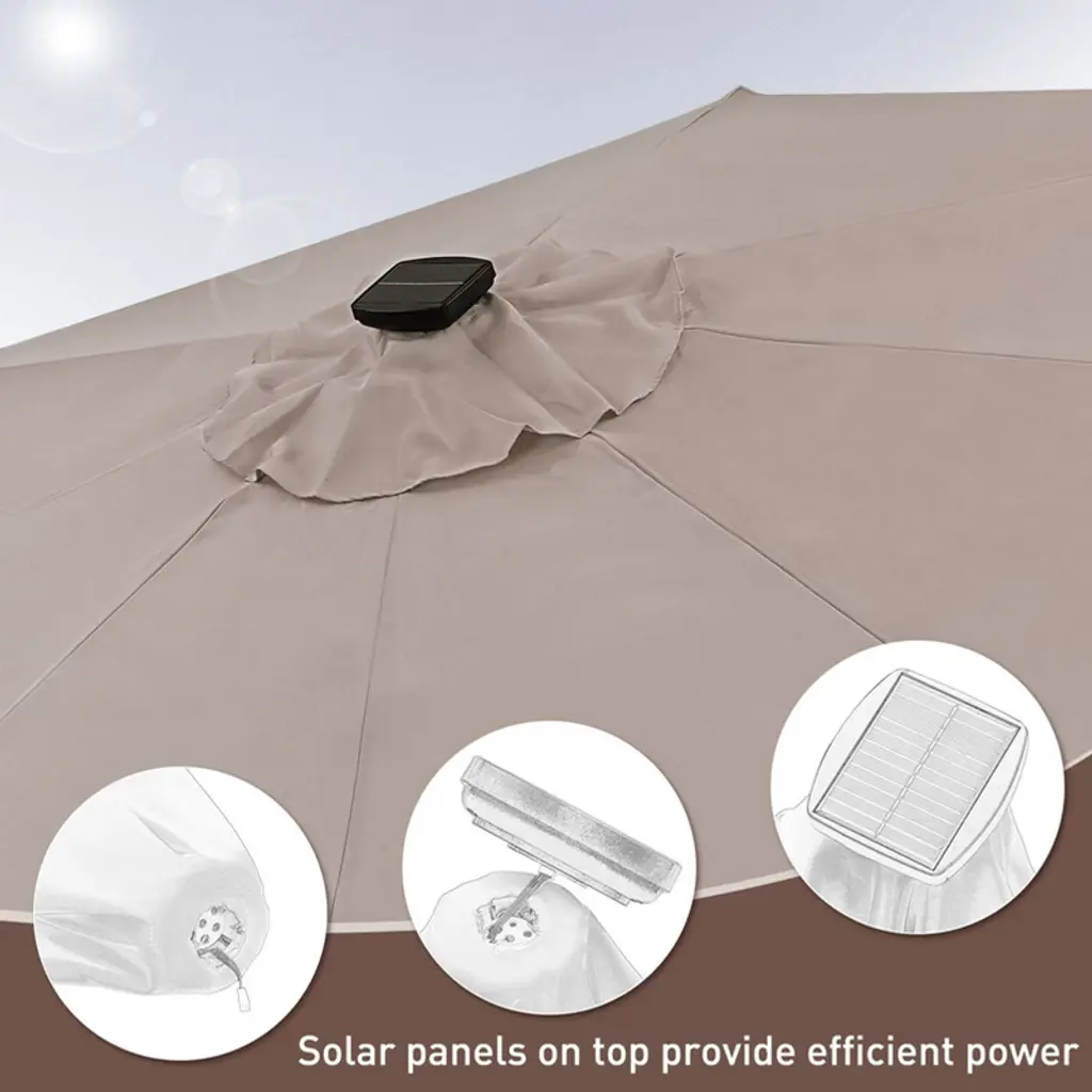 Color:Khaki; Material of umbrella:18g polyester; Dimetre umbrella pole:Φ1.5inch ; Qty of umbrella rib:8; Qty of Led lights:64; Size of solar panel:4.72”L * 4.53”W *1.22”H; Power of solar panel:1.2W; Tilt: Yes Crank:Yes