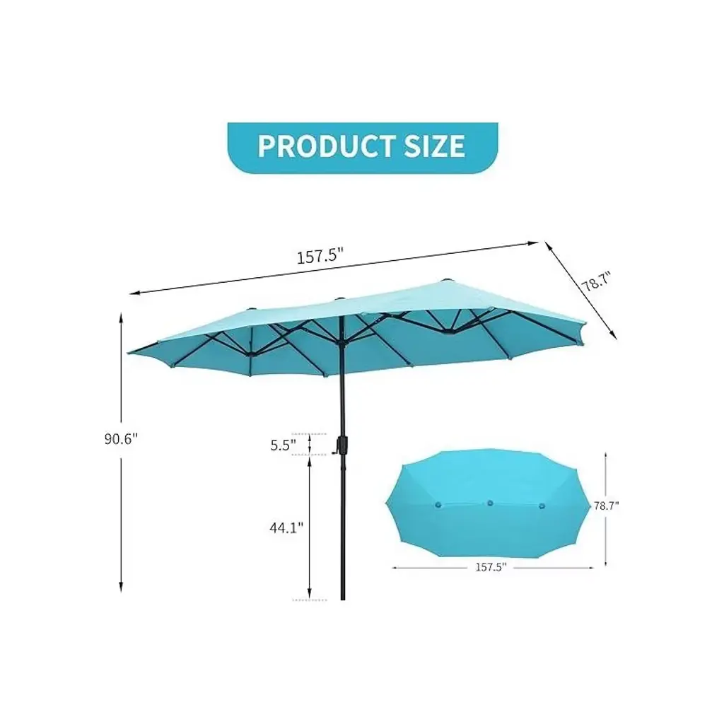 Color: Blue Material : 180G polyester,steel Umbrella size :13ft Lights:NO Note - The handle of the umbrella is 1.5 inches in diameter, please note the size if you want to fit it into the table Easy Crank Mechanism - The manual crank mechanism located on the outdoor patio umbrella pole is easy to control for smooth opening and adjustment. Polyester Canopy - This patio umbrella was built with high quality polyester. Excellent color fastness makes the umbrella stay elegant, and the cloth can block up the harmful UV rays and weaken the heat of the sunlight, so as to protect your skin. Large shade space - 13 ft x 6.6 ft rectangular market patio umbrella provides larger shading area up to 85 square feet shade area when fully open. Ideal for family parties, garden, backyard, poolside and any other outdoor area. Durable and sturdy materials - Constructed with a heavy-duty anti-oxidation spray painted rust-resistant steel pole paired with 12 durable steel ribs supporting the umbrella top to provide stronger support. In addition, the premium breathable fade-resistant polyester fabric blocks most of the sunlight and provides ample shade to keep you cool and comfortable while you enjoy the sunny day.