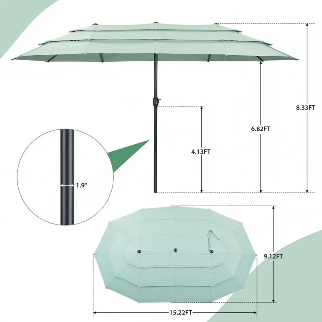 Color:Green Height of Umbrella:8.33FT. Width of Umbrella:9.12FT. Rod diameter:1.9” Gross weight:41.89lbs Package size:55.91”Lx16.54”Wx6.3”H Package include: 1x Umbrella Notice: Umbrella base is not included