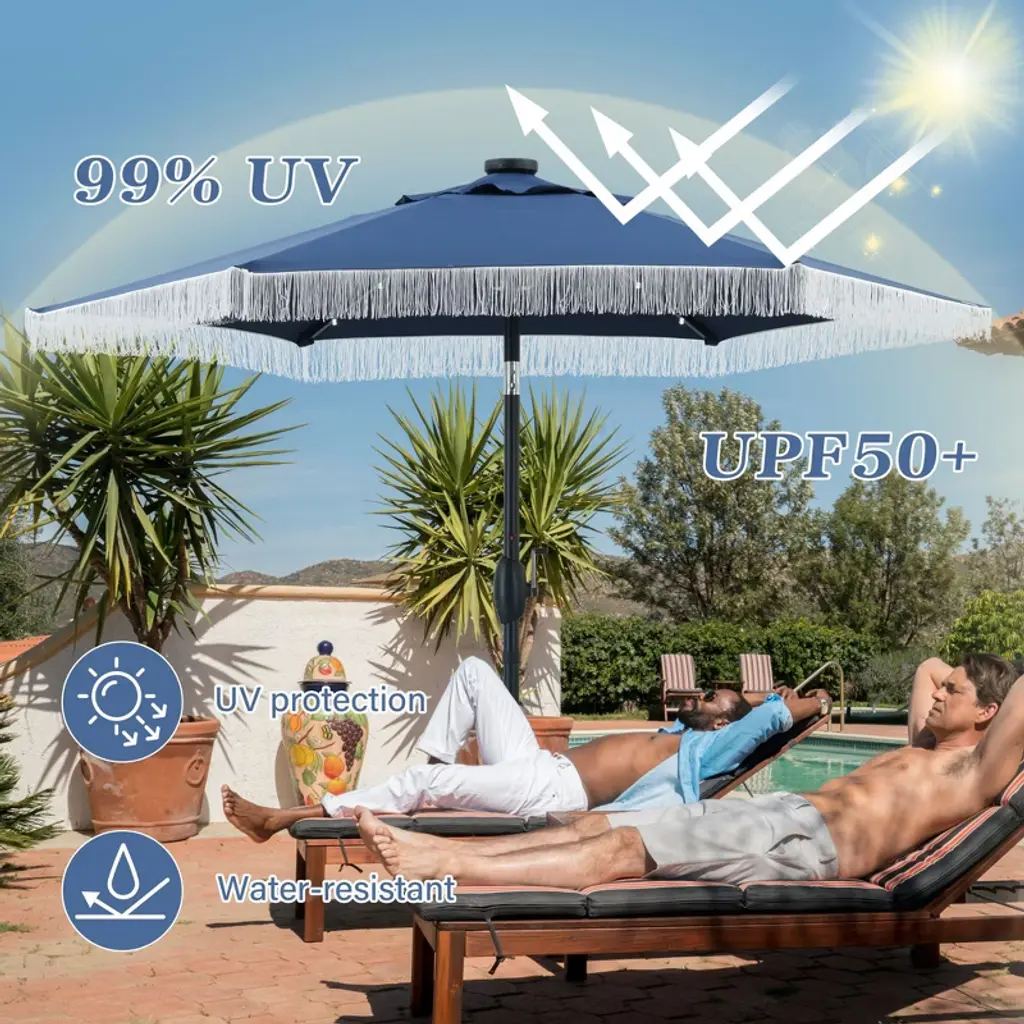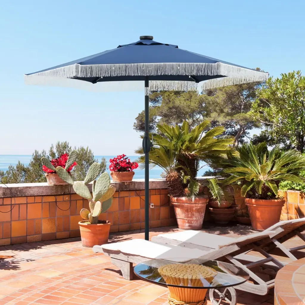 Ainfox 7.5ft Outdoor Tassel Umbrella, Beach Umbrella Navy Blue With Lights