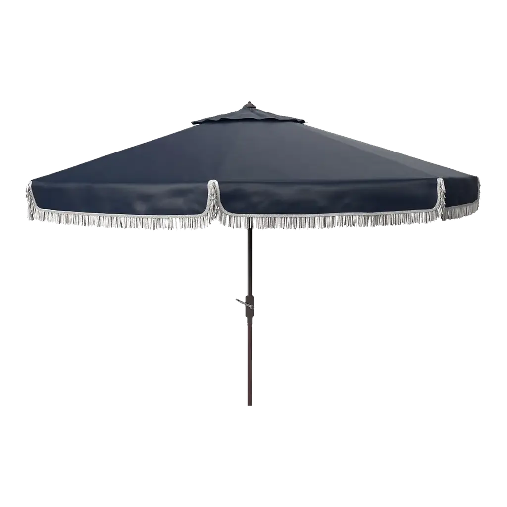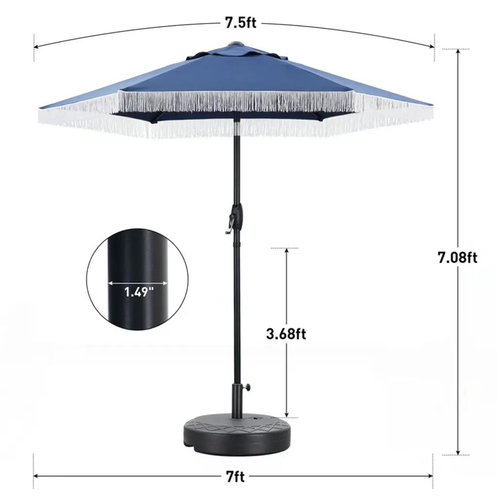7.5ft patio umbrella With tassels Product size: 7.5' L X 7'W X 7.08'H, Pole diametre:1.49", Color:Blue Gross Weight: 10.14lbs Offers UPF 50+ protection, blocking over 98% of harmful UV rays. Stay cool and comfortable while effectively