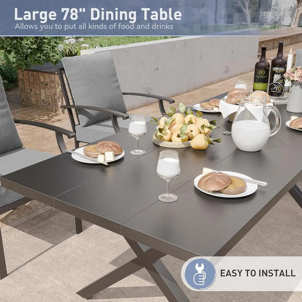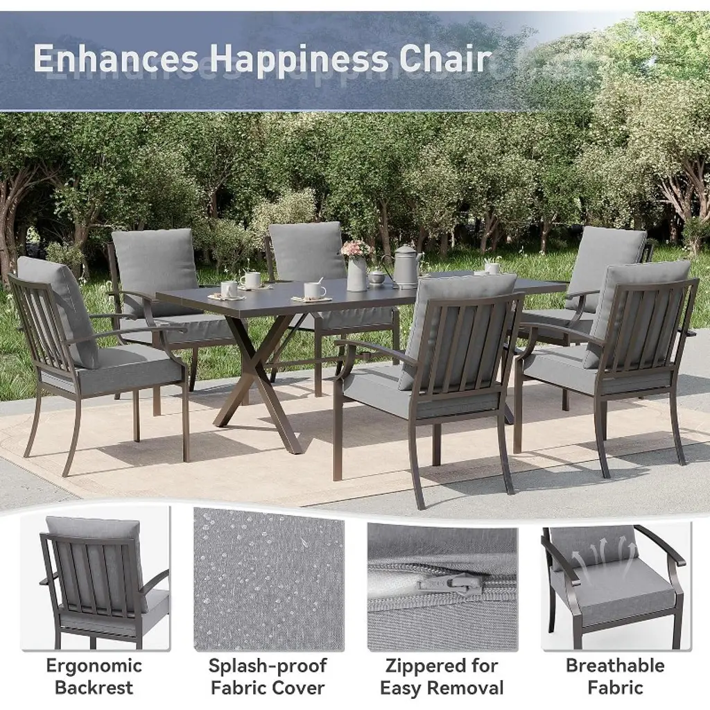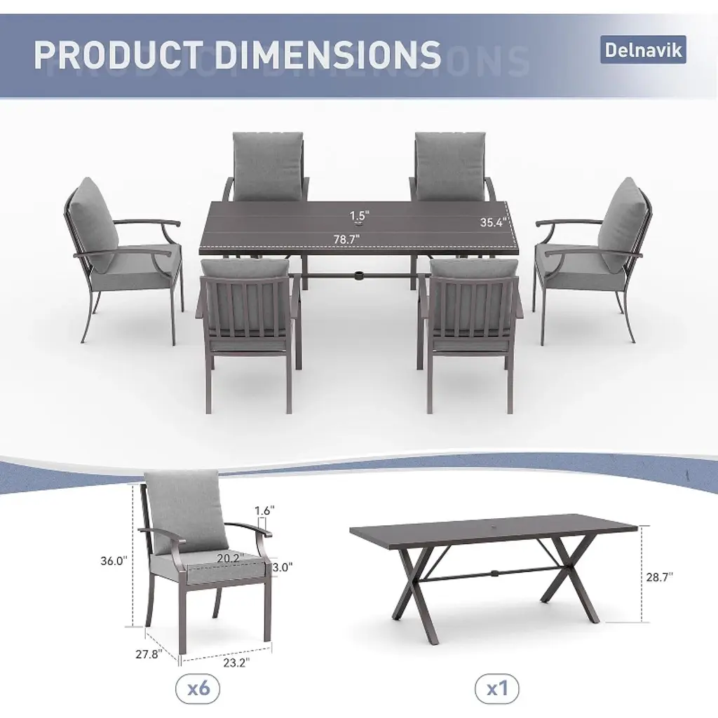Alaulm 7 Piece Patio Dining Set Outdoor Furniture, Metal Patio Furniture Set 6 Fixed Chairs And Large Table With Umbrella Cutout For Garden, Grey