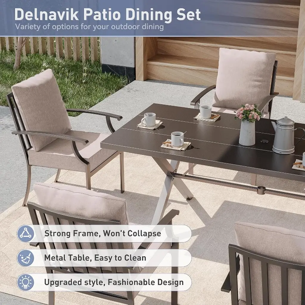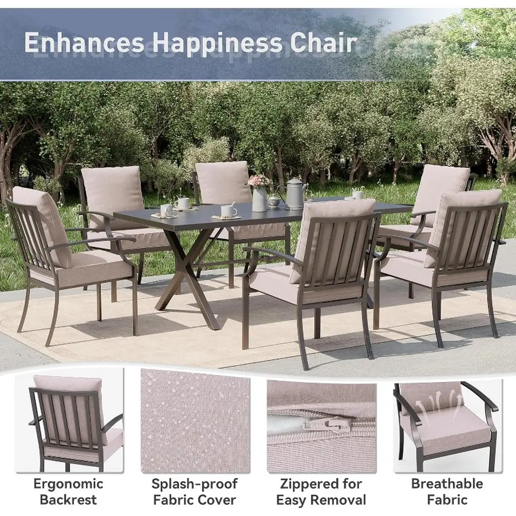 Alaulm 7 Piece Patio Dining Set Outdoor Furniture, Metal Patio Furniture Set 6 Fixed Chairs And Large Table With Umbrella Cutout For Garden, Sand