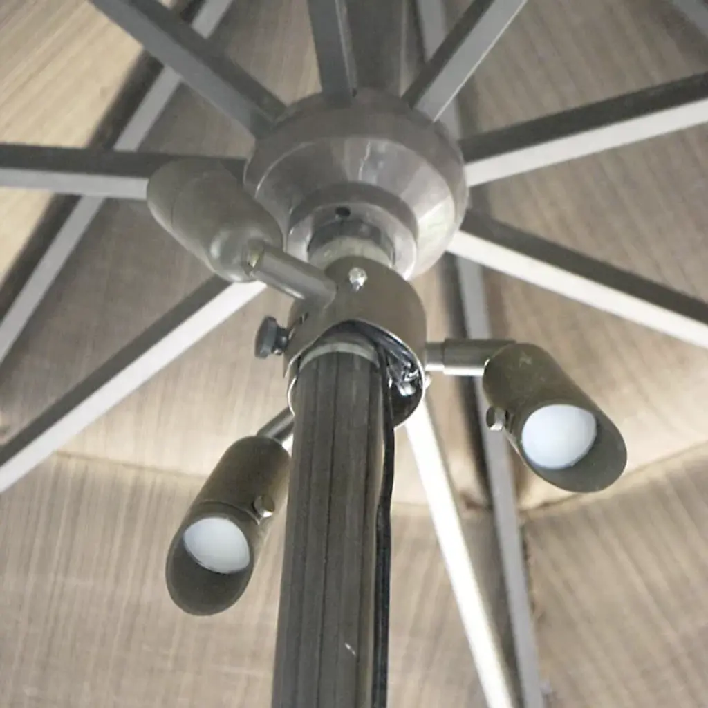 Just because you want a little shade doesn’t mean you have to sit in the dark! The Focus Industries Aluminum LED Umbrella Lights (one complete unit) fits snuggly on your umbrella pole with a heavy duty, adjustable aluminum bracket and has three independently adjustable heads that direct light where you need it most. Connects to a 12v landscaping electrical system via a 10 ft black wire that leads from the fixture. Transformer is necessary but not included.